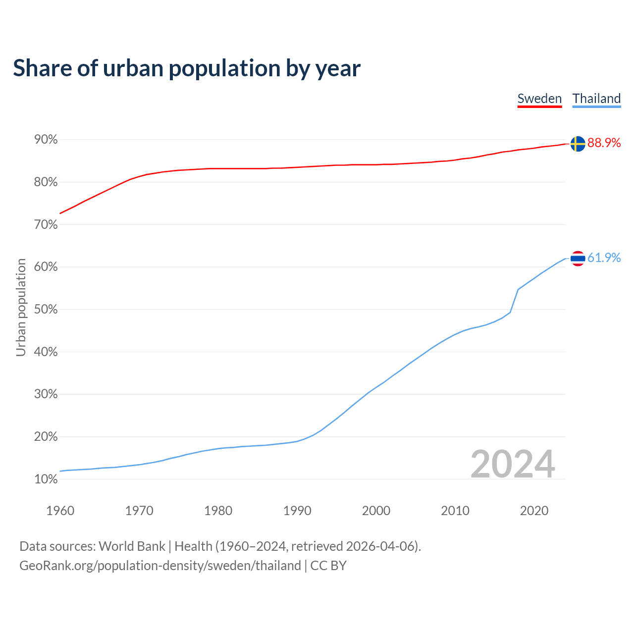From 2004 to 2024, the share of urban population changed from 84.3% to 88.9% in Sweden and from 36.8% to 61.9% in Thailand.