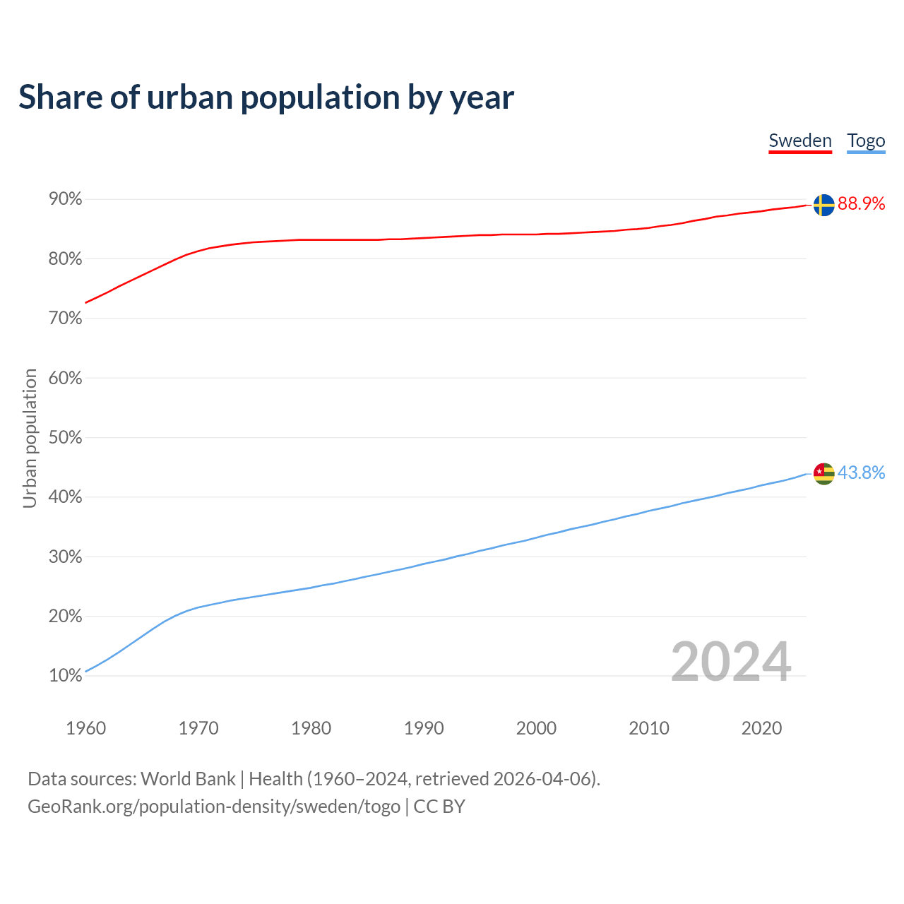 From 2004 to 2024, the share of urban population changed from 84.3% to 88.9% in Sweden and from 34.9% to 43.8% in Togo.
