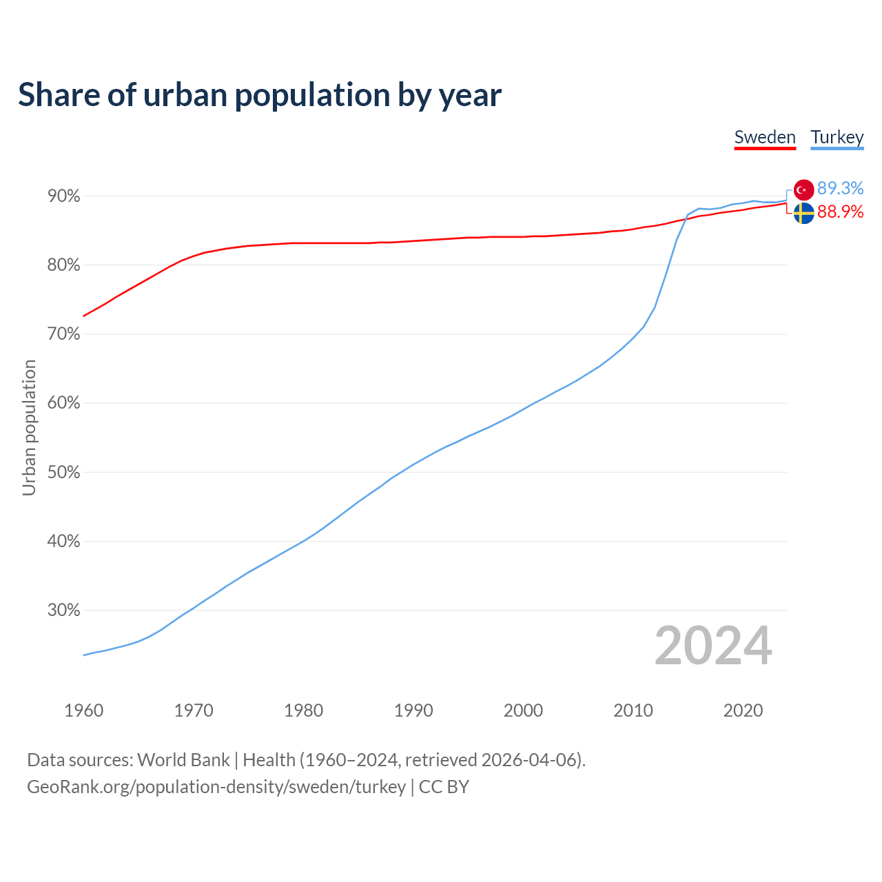 From 2004 to 2024, the share of urban population changed from 84.3% to 88.9% in Sweden and from 62.4% to 89.3% in Turkey.