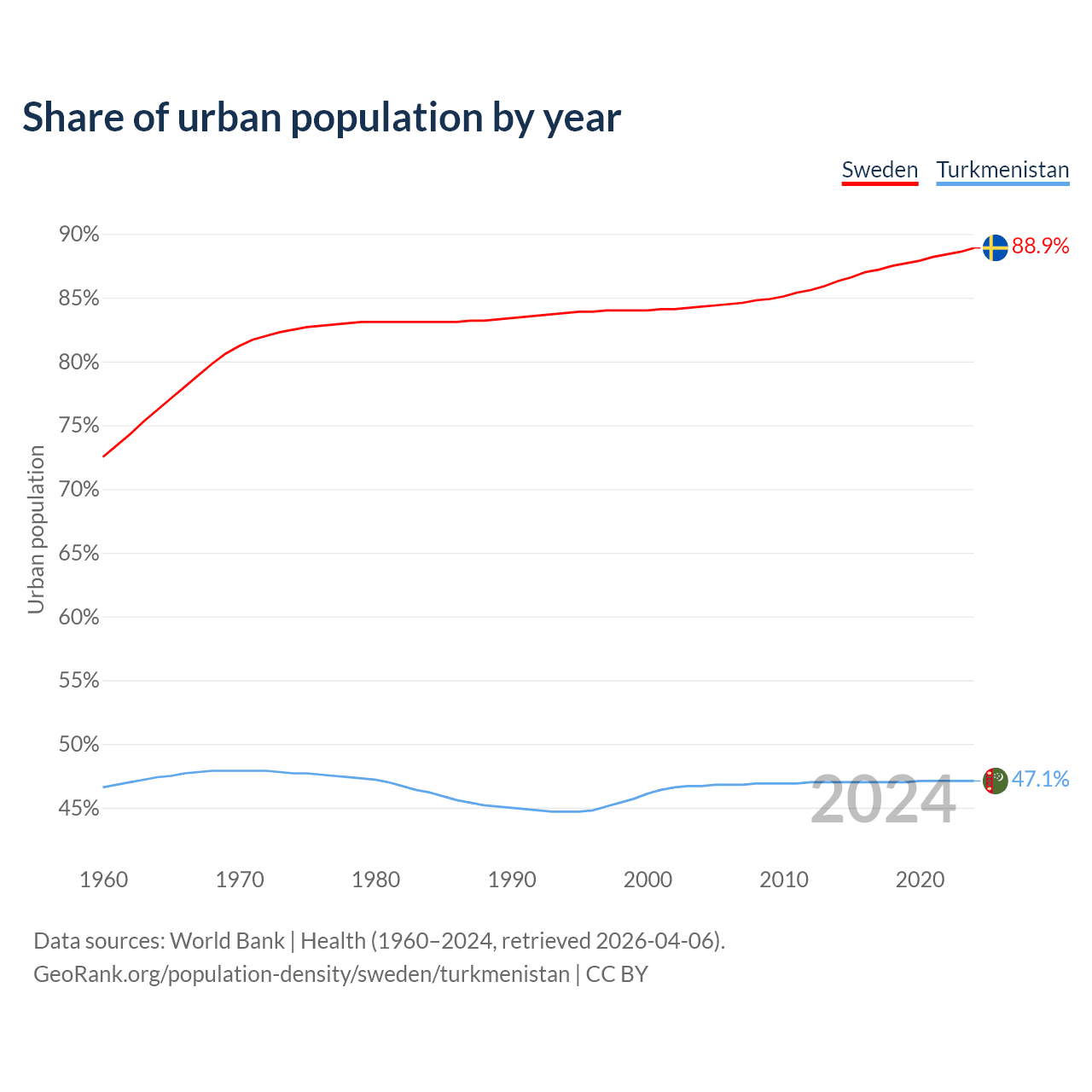 From 2004 to 2024, the share of urban population changed from 84.3% to 88.9% in Sweden and from 46.7% to 47.1% in Turkmenistan.
