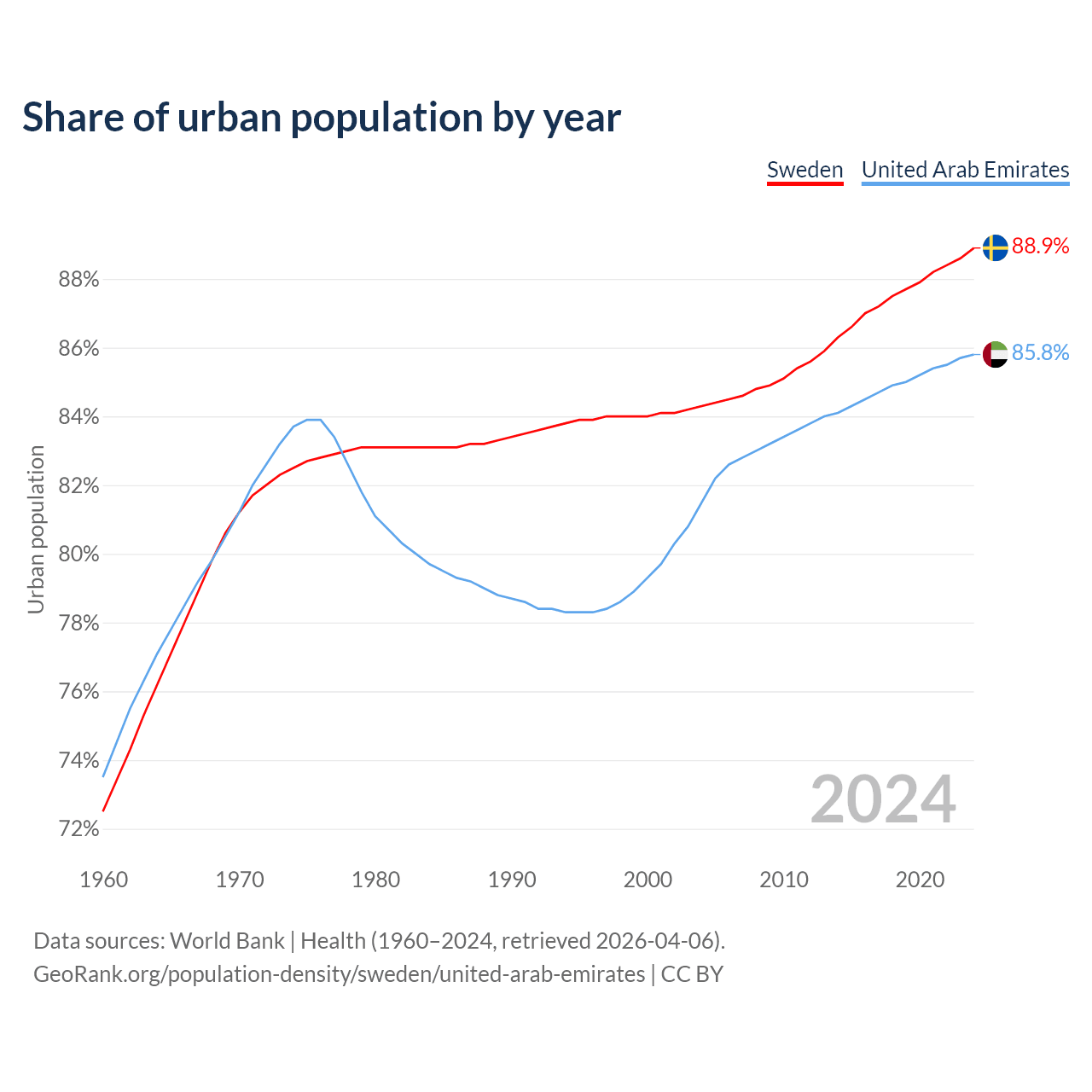 From 2004 to 2024, the share of urban population changed from 84.3% to 88.9% in Sweden and from 81.5% to 85.8% in the United Arab Emirates.