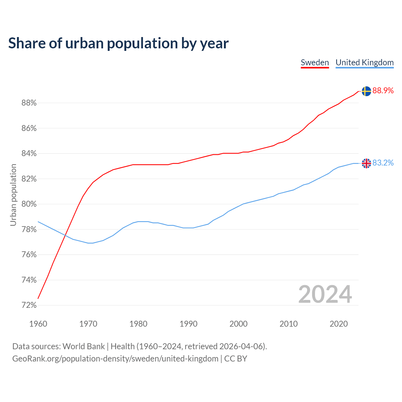 From 2004 to 2024, the share of urban population changed from 84.3% to 88.9% in Sweden and from 80.3% to 83.2% in the United Kingdom.