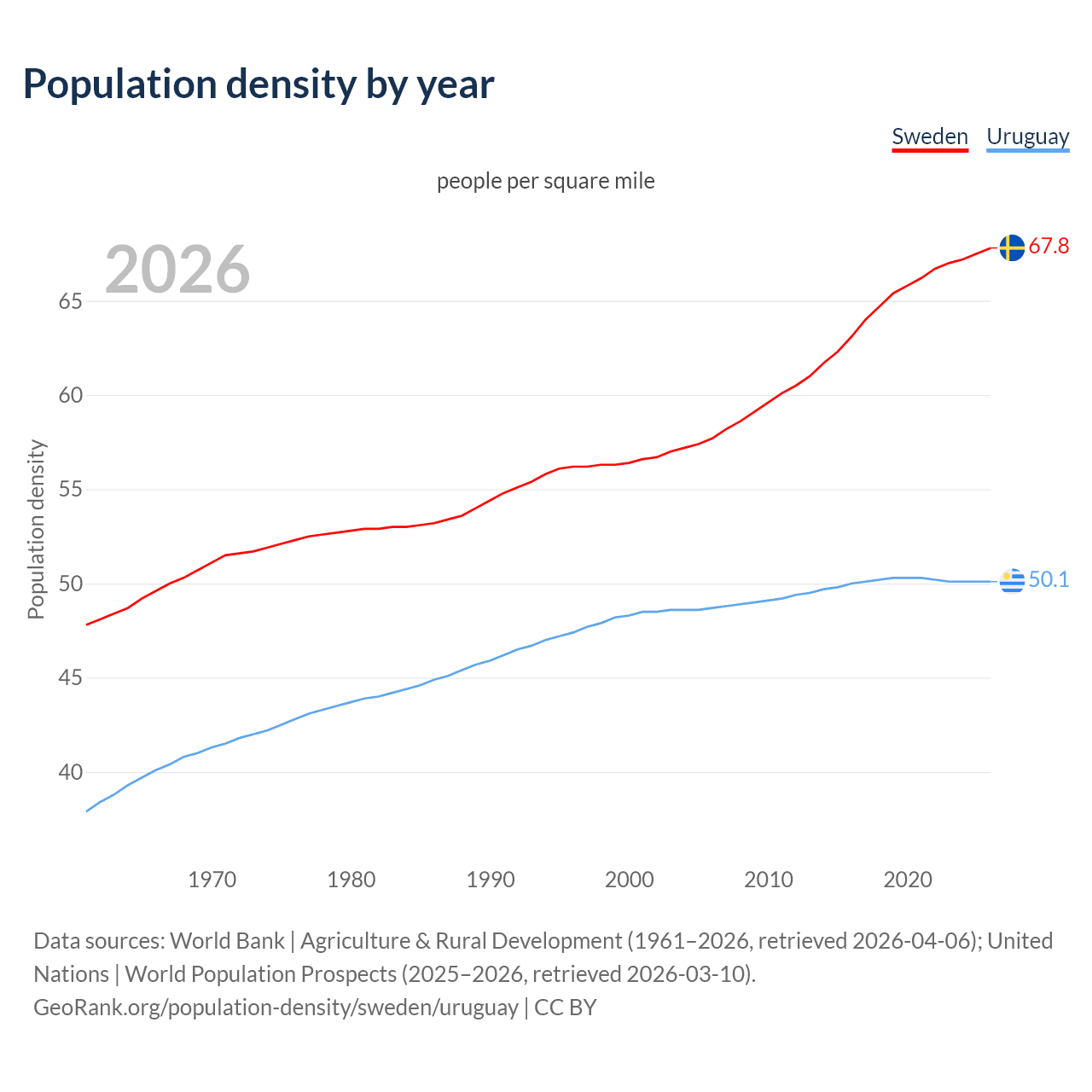 Sweden has a population density of 67.8 people per square mile compared to 50.1 people in Uruguay. Sweden has 455,646 sq ft of land per person vs 560,081 sq ft in Uruguay. Sweden and Uruguay rank 163rd and 173rd by population density, respectively.