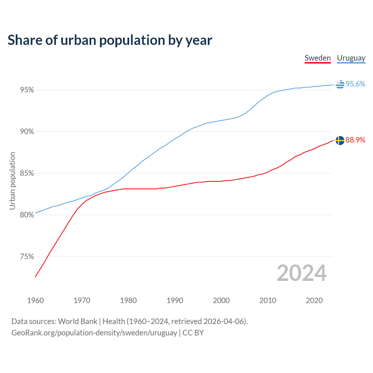 From 2004 to 2024, the share of urban population changed from 84.3% to 88.9% in Sweden and from 91.8% to 95.6% in Uruguay.