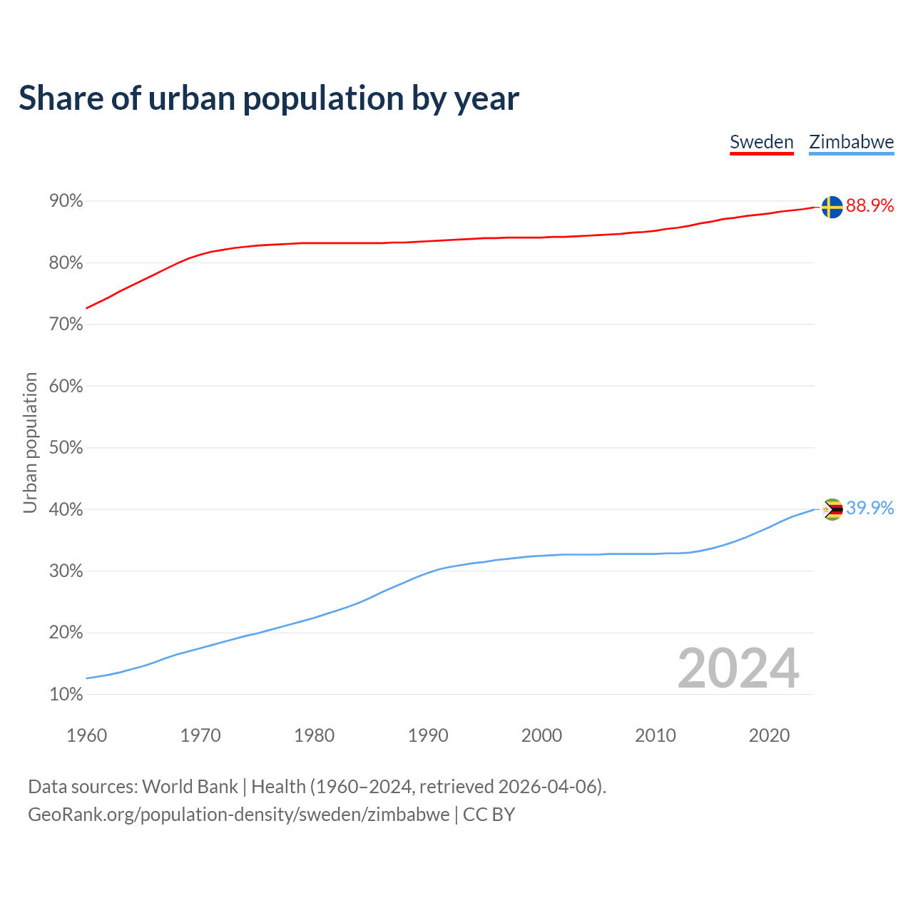 From 2004 to 2024, the share of urban population changed from 84.3% to 88.9% in Sweden and from 32.6% to 39.9% in Zimbabwe.