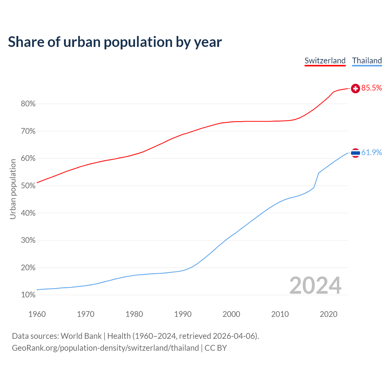 From 2004 to 2024, the share of urban population changed from 73.5% to 85.5% in Switzerland and from 36.8% to 61.9% in Thailand.