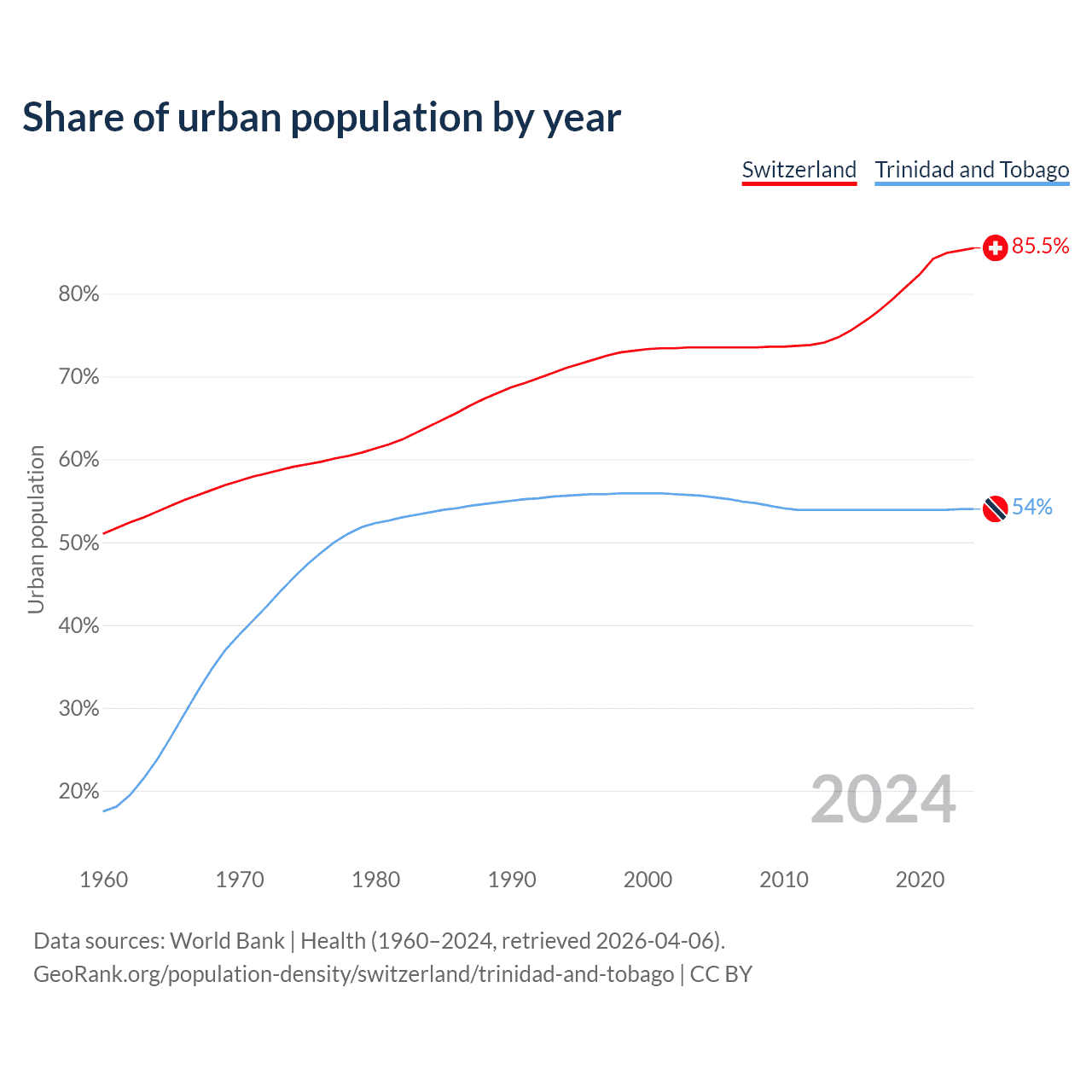 From 2004 to 2024, the share of urban population changed from 73.5% to 85.5% in Switzerland and from 55.6% to 54% in Trinidad and Tobago.