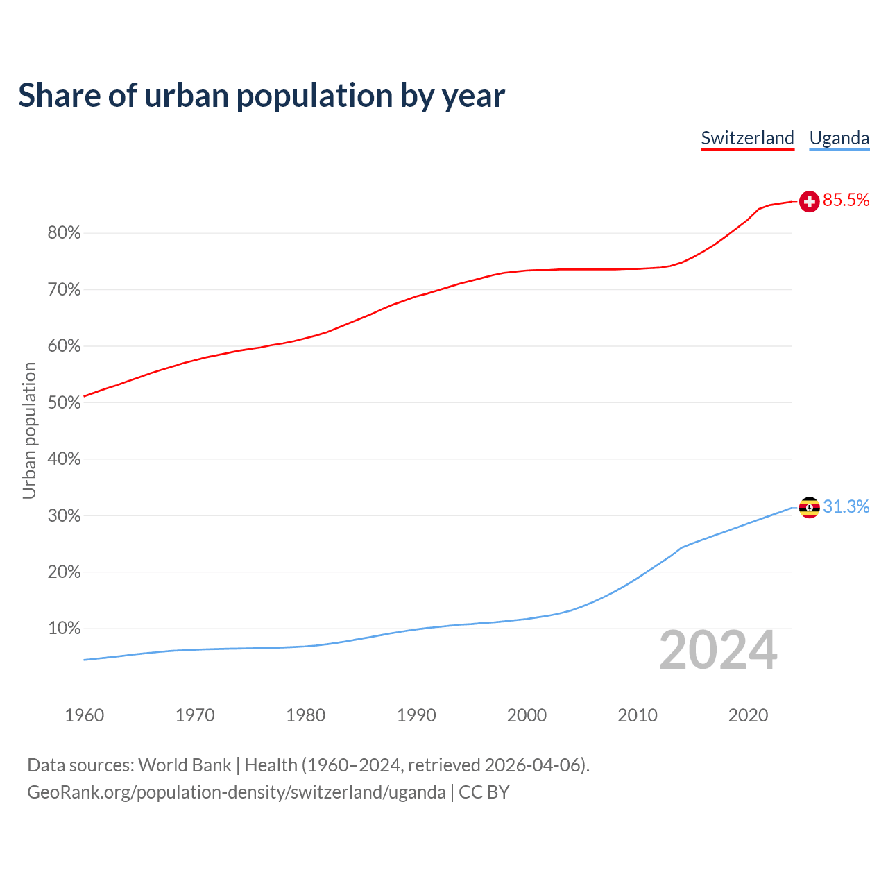 From 2004 to 2024, the share of urban population changed from 73.5% to 85.5% in Switzerland and from 13.1% to 31.3% in Uganda.