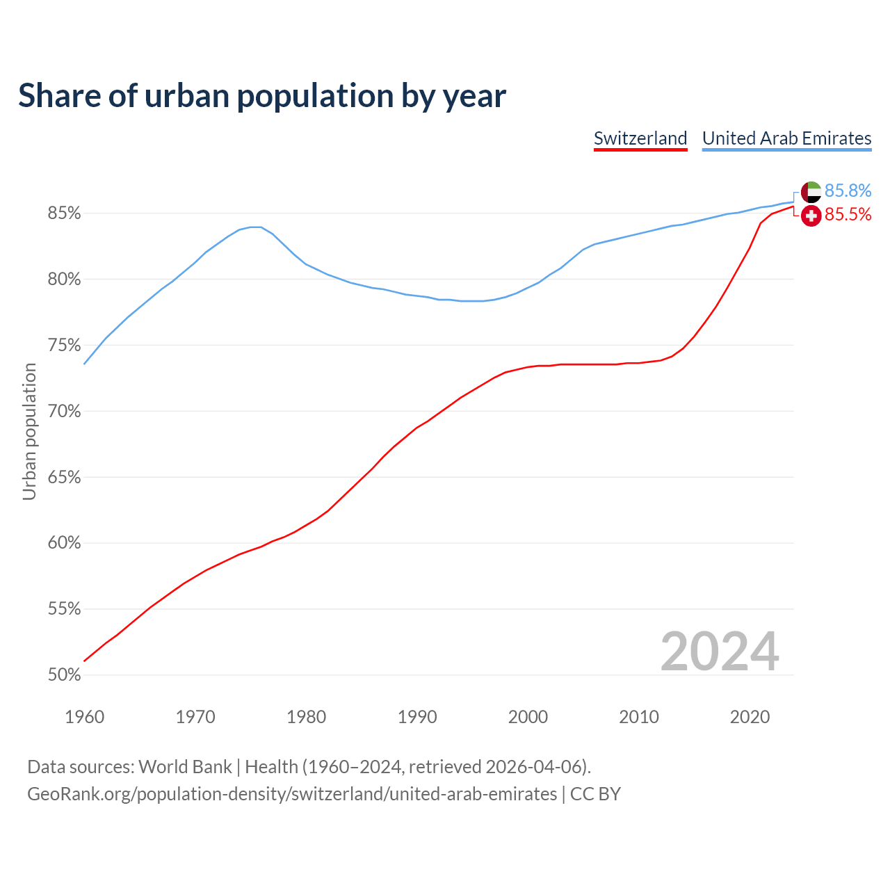 From 2004 to 2024, the share of urban population changed from 73.5% to 85.5% in Switzerland and from 81.5% to 85.8% in the United Arab Emirates.