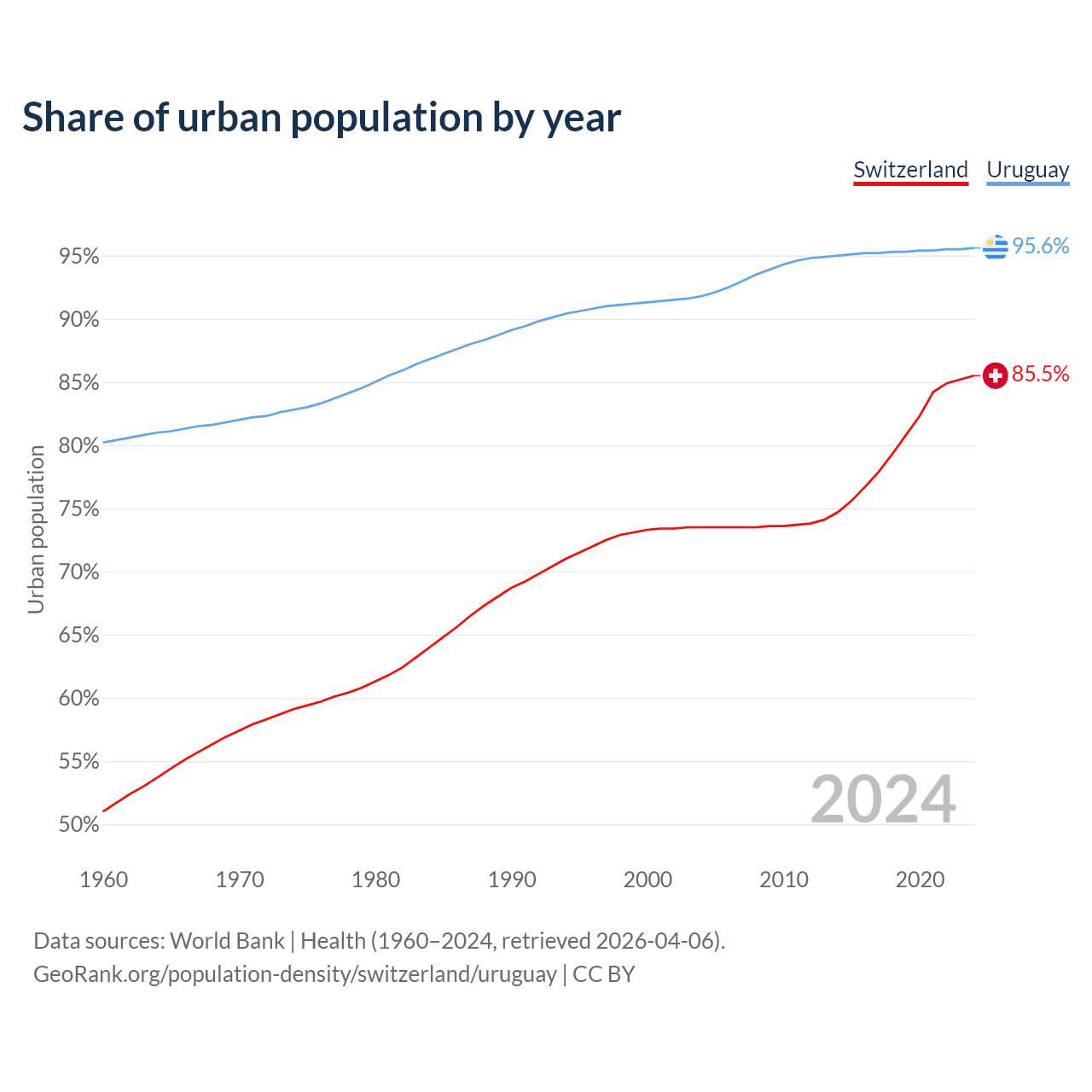 From 2004 to 2024, the share of urban population changed from 73.5% to 85.5% in Switzerland and from 91.8% to 95.6% in Uruguay.