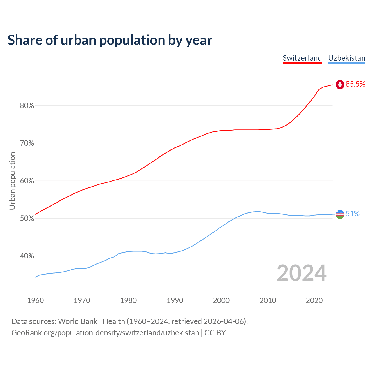From 2004 to 2024, the share of urban population changed from 73.5% to 85.5% in Switzerland and from 50.6% to 51% in Uzbekistan.