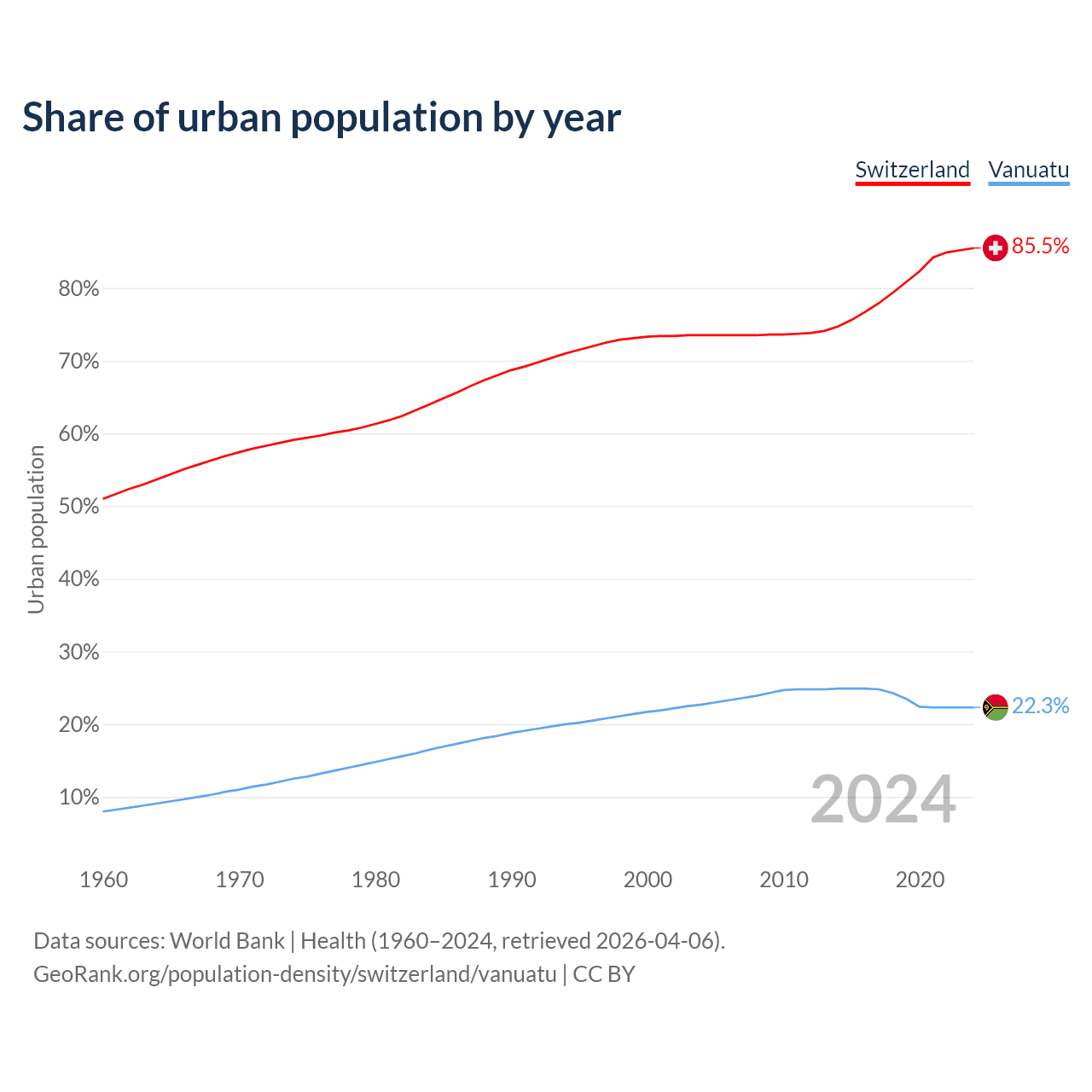 From 2004 to 2024, the share of urban population changed from 73.5% to 85.5% in Switzerland and from 22.7% to 22.3% in Vanuatu.