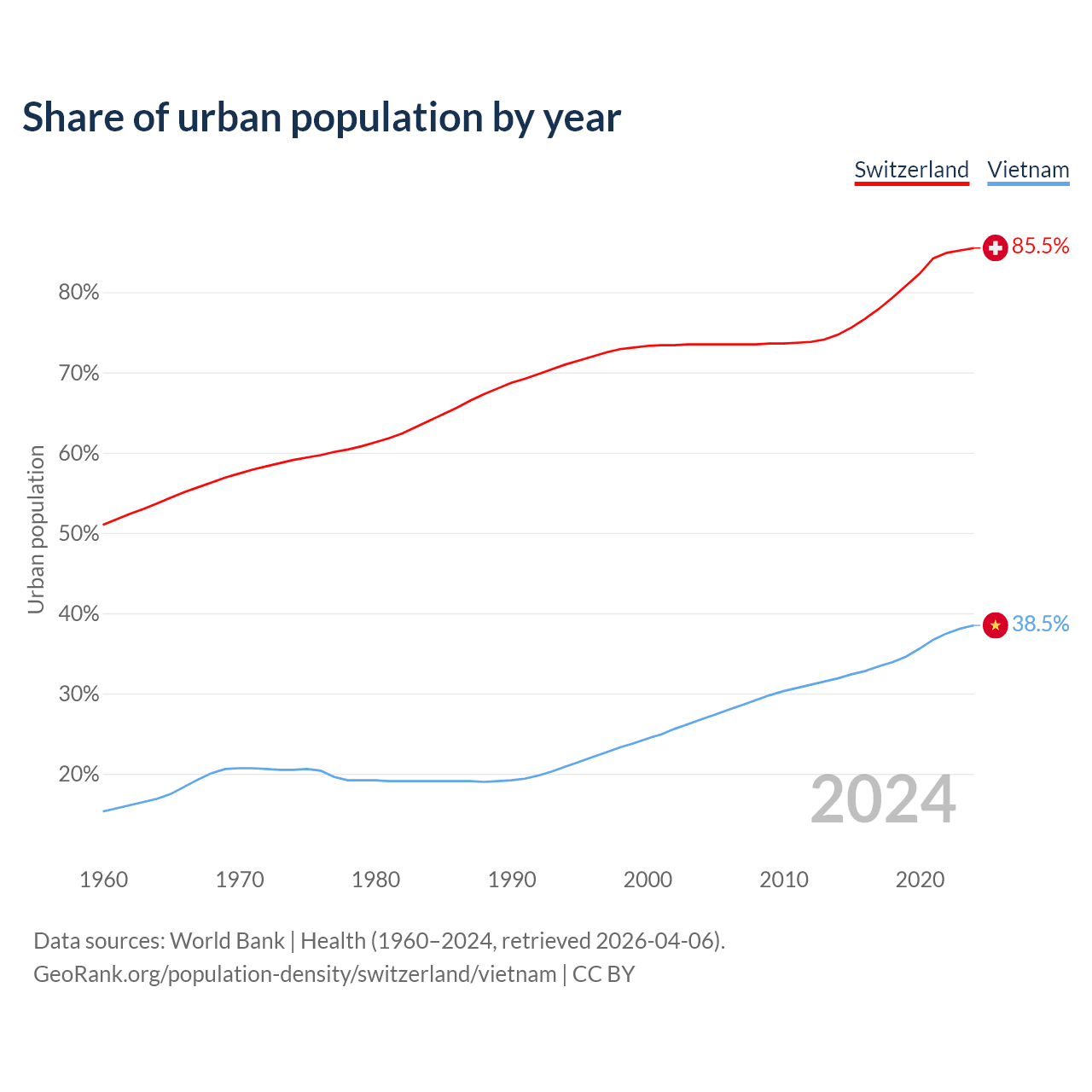 From 2006 to 2026, population density in Switzerland increased by 21.6%, compared to a 24.1% growth in Vietnam.