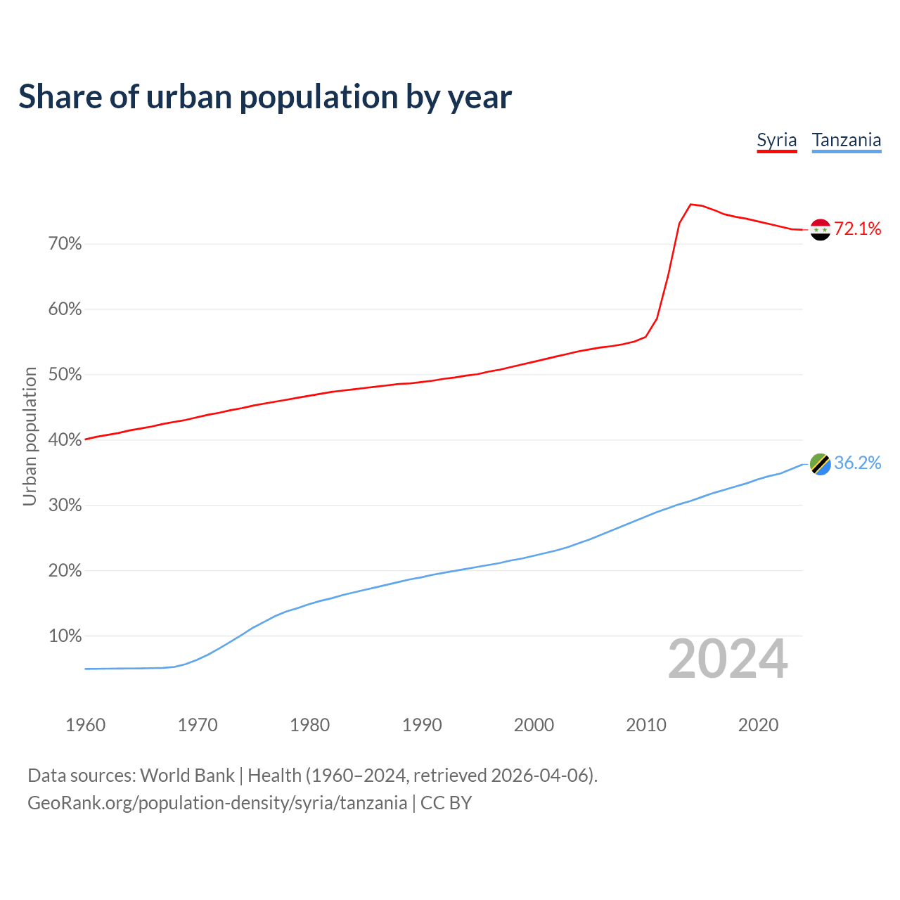 From 2004 to 2024, the share of urban population changed from 53.5% to 72.1% in Syria and from 24.1% to 36.2% in Tanzania.