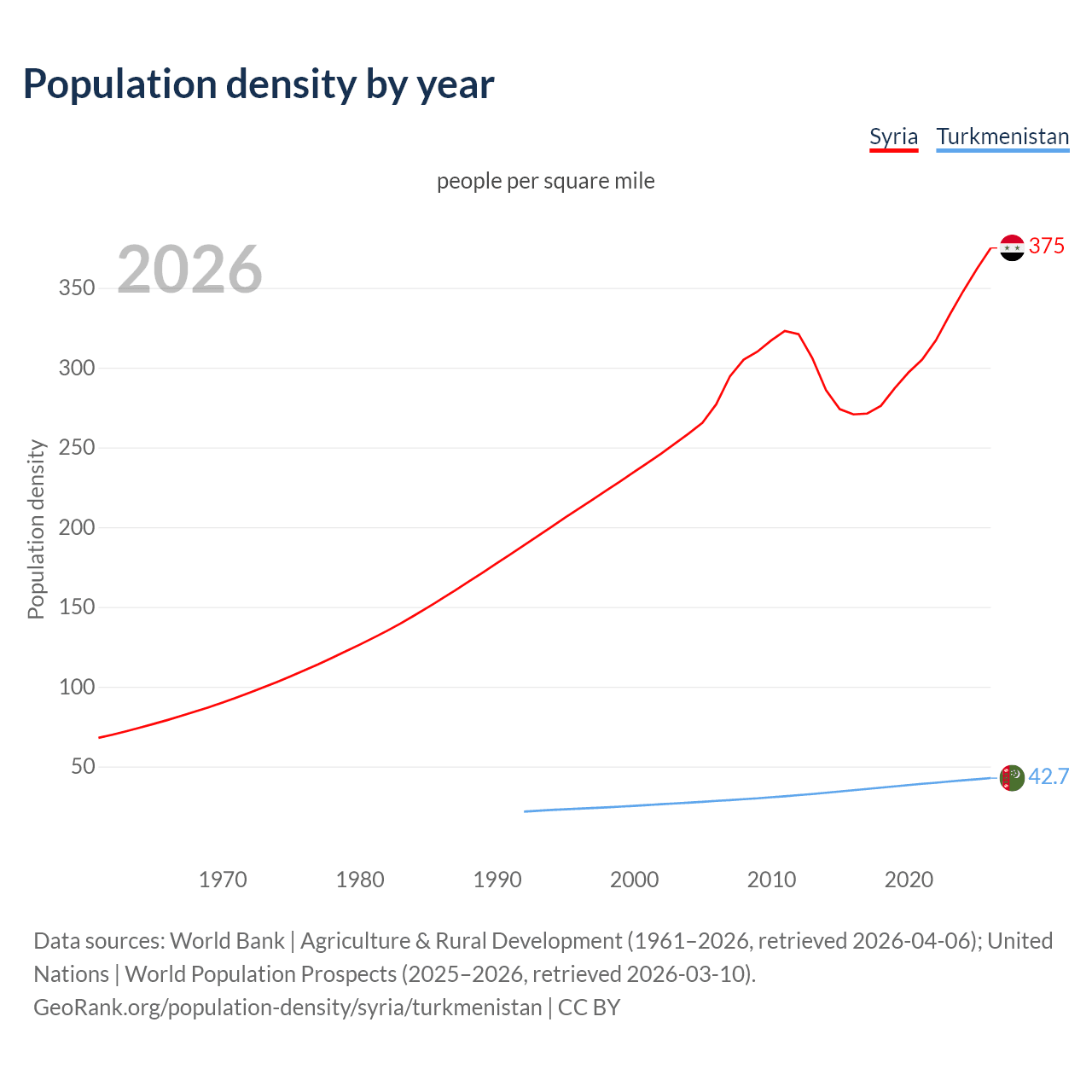From 2006 to 2026, population density in Syria increased by 35.5%, compared to a 50.5% growth in Turkmenistan.