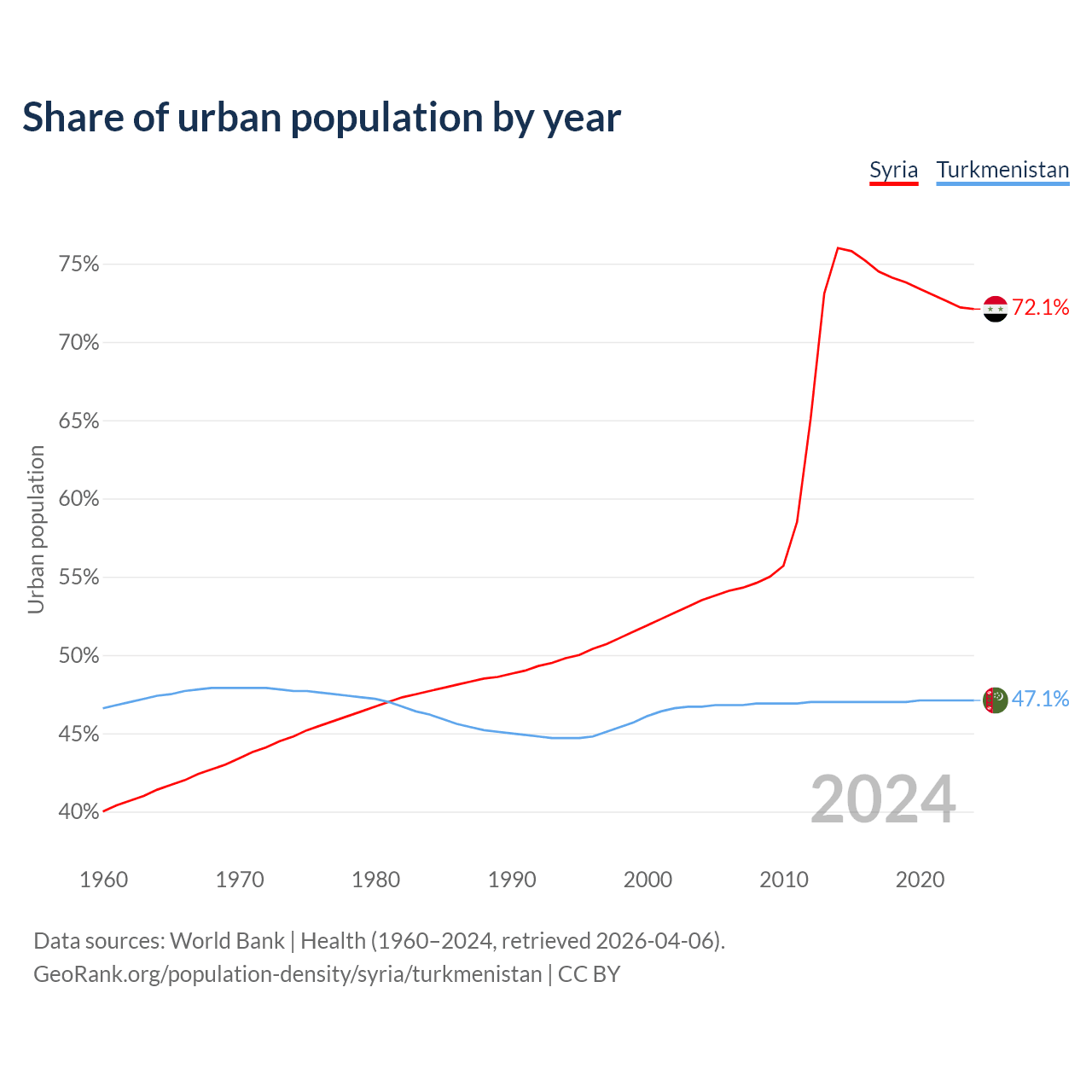 From 2004 to 2024, the share of urban population changed from 53.5% to 72.1% in Syria and from 46.7% to 47.1% in Turkmenistan.