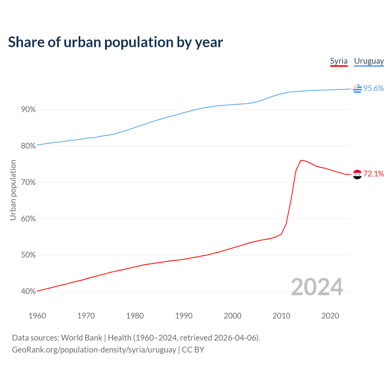 From 2004 to 2024, the share of urban population changed from 53.5% to 72.1% in Syria and from 91.8% to 95.6% in Uruguay.