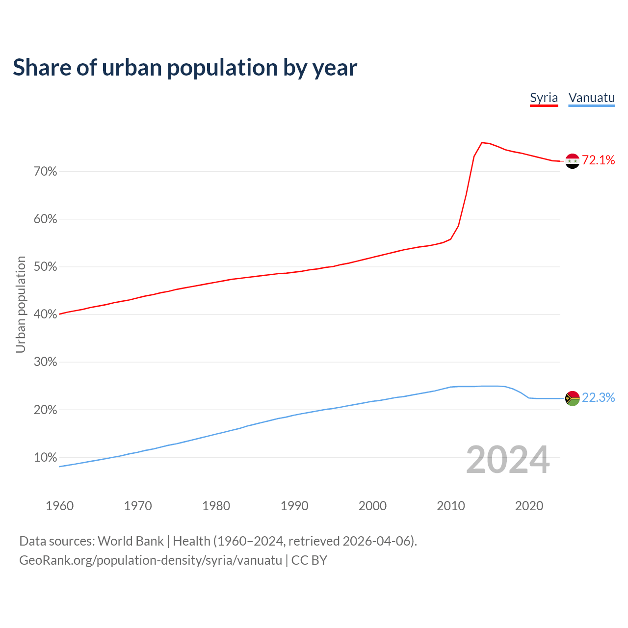 From 2004 to 2024, the share of urban population changed from 53.5% to 72.1% in Syria and from 22.7% to 22.3% in Vanuatu.