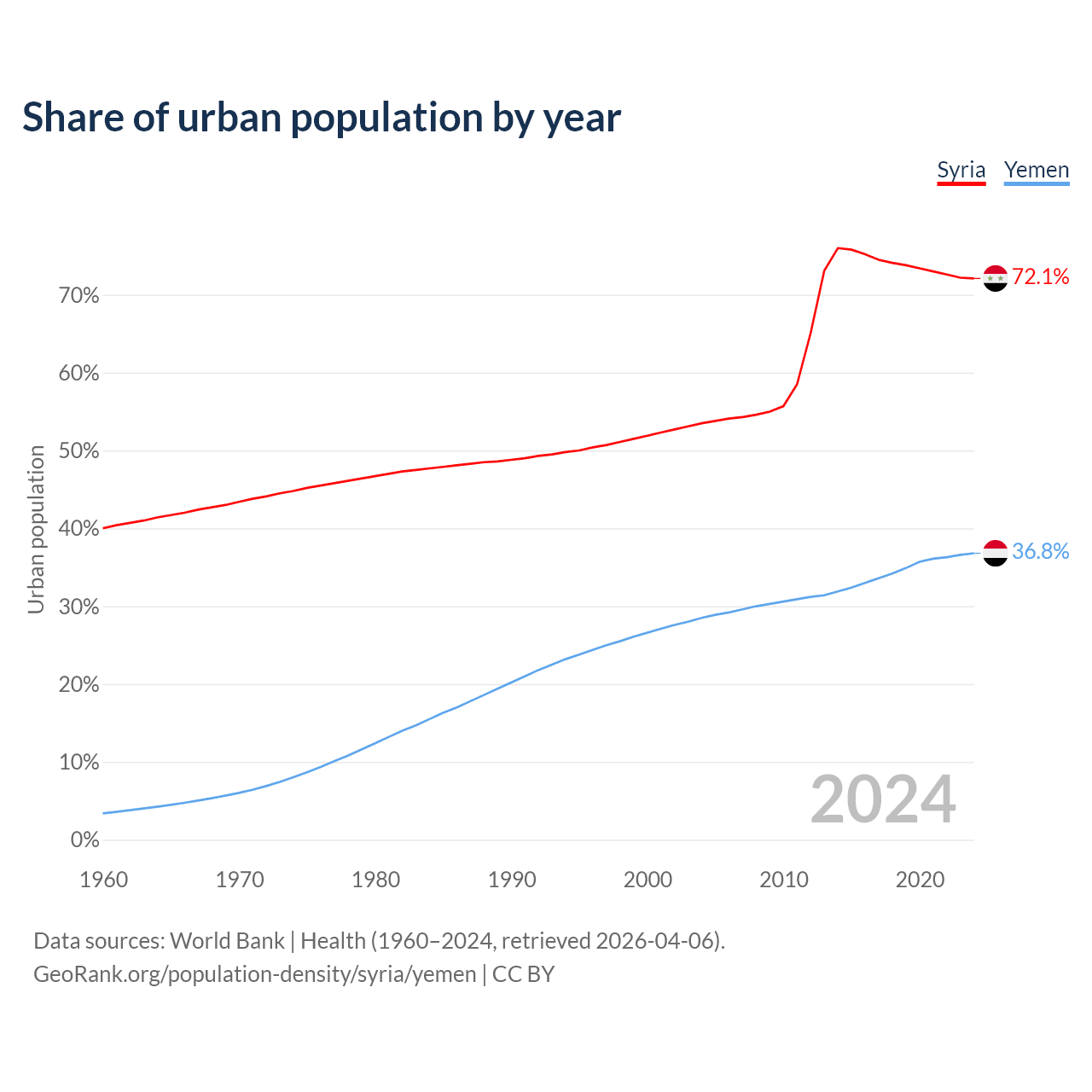 From 2004 to 2024, the share of urban population changed from 53.5% to 72.1% in Syria and from 28.5% to 36.8% in Yemen.