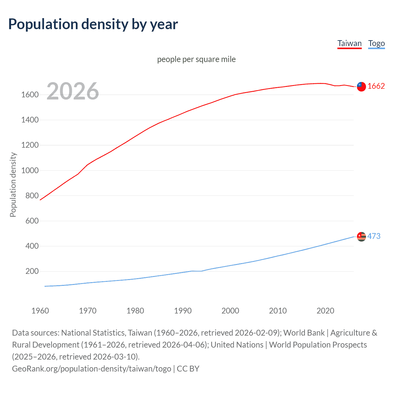 From 2006 to 2026, population density in Taiwan increased by 1.78%, compared to a 65.2% growth in Togo.
