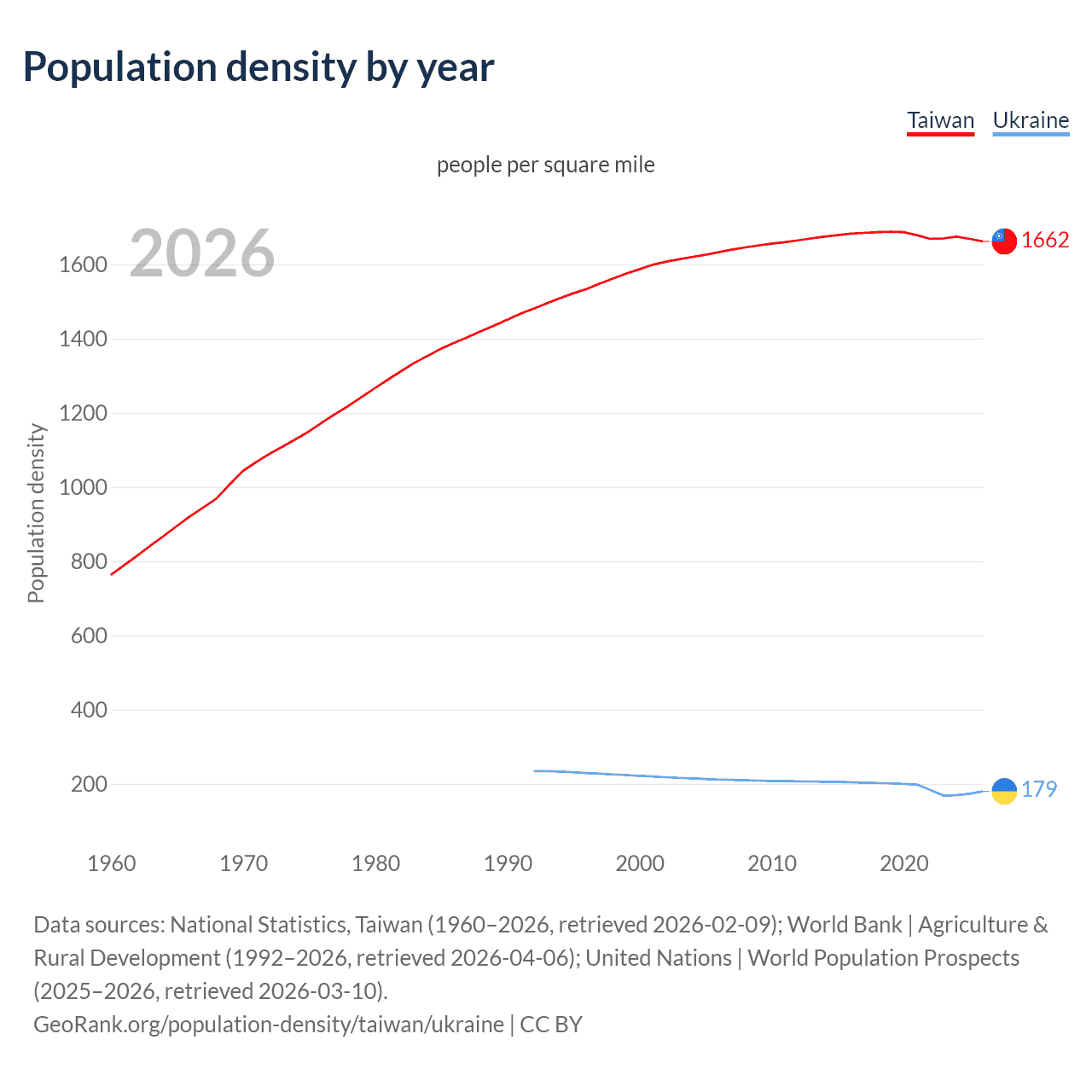 From 2006 to 2026, population density in Taiwan increased by 1.78%, compared to a 15.1% decline in Ukraine.