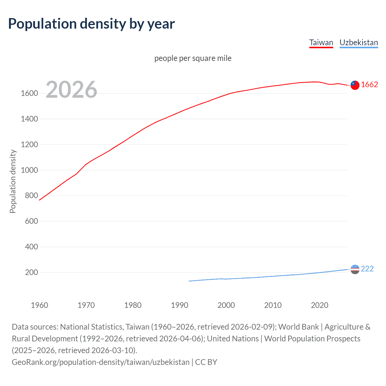 From 2006 to 2026, population density in Taiwan increased by 1.78%, compared to a 39.9% growth in Uzbekistan.