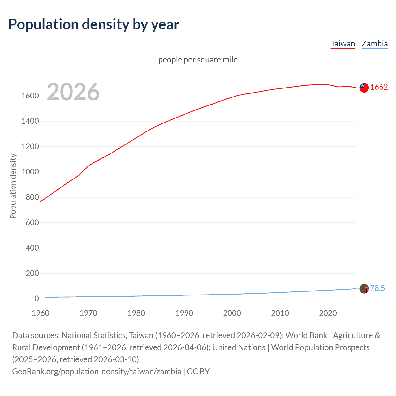 From 2006 to 2026, population density in Taiwan increased by 1.78%, compared to a 85.7% growth in Zambia.