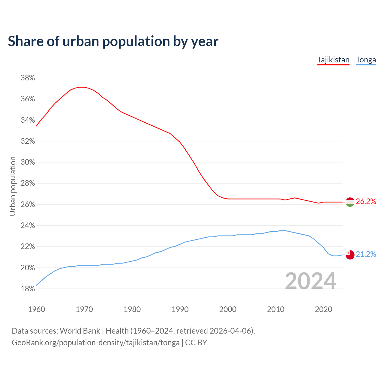 From 2004 to 2024, the share of urban population changed from 26.5% to 26.2% in Tajikistan and from 23.1% to 21.2% in Tonga.
