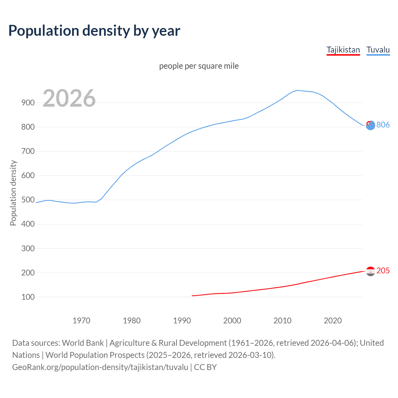 From 2006 to 2026, population density in Tajikistan increased by 57%, compared to a 7.1% decline in Tuvalu.
