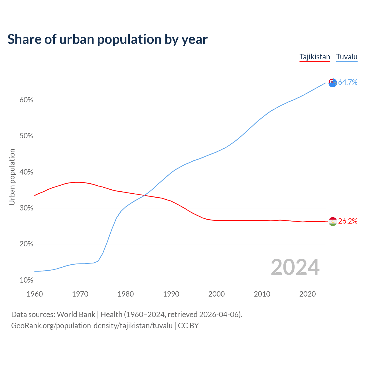 From 2004 to 2024, the share of urban population changed from 26.5% to 26.2% in Tajikistan and from 48.4% to 64.7% in Tuvalu.