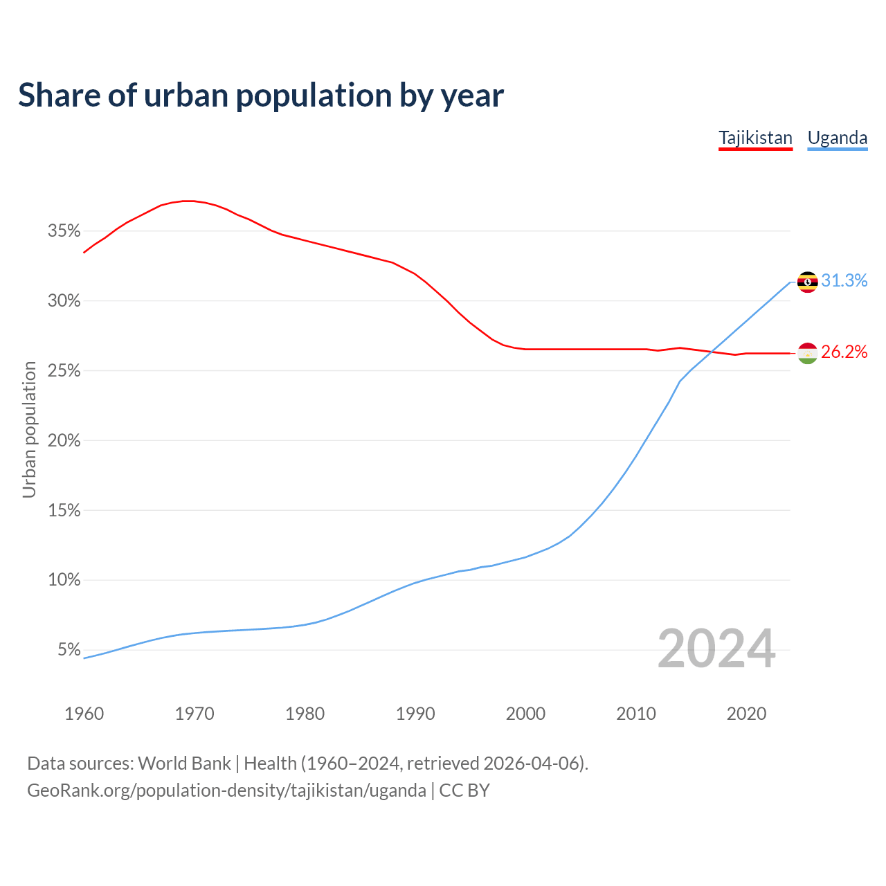 From 2004 to 2024, the share of urban population changed from 26.5% to 26.2% in Tajikistan and from 13.1% to 31.3% in Uganda.
