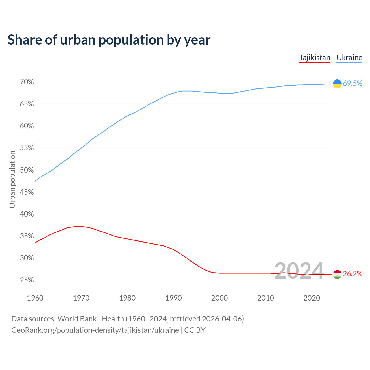 From 2004 to 2024, the share of urban population changed from 26.5% to 26.2% in Tajikistan and from 67.6% to 69.5% in Ukraine.
