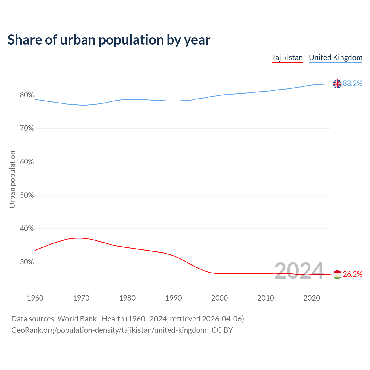 From 2004 to 2024, the share of urban population changed from 26.5% to 26.2% in Tajikistan and from 80.3% to 83.2% in the United Kingdom.