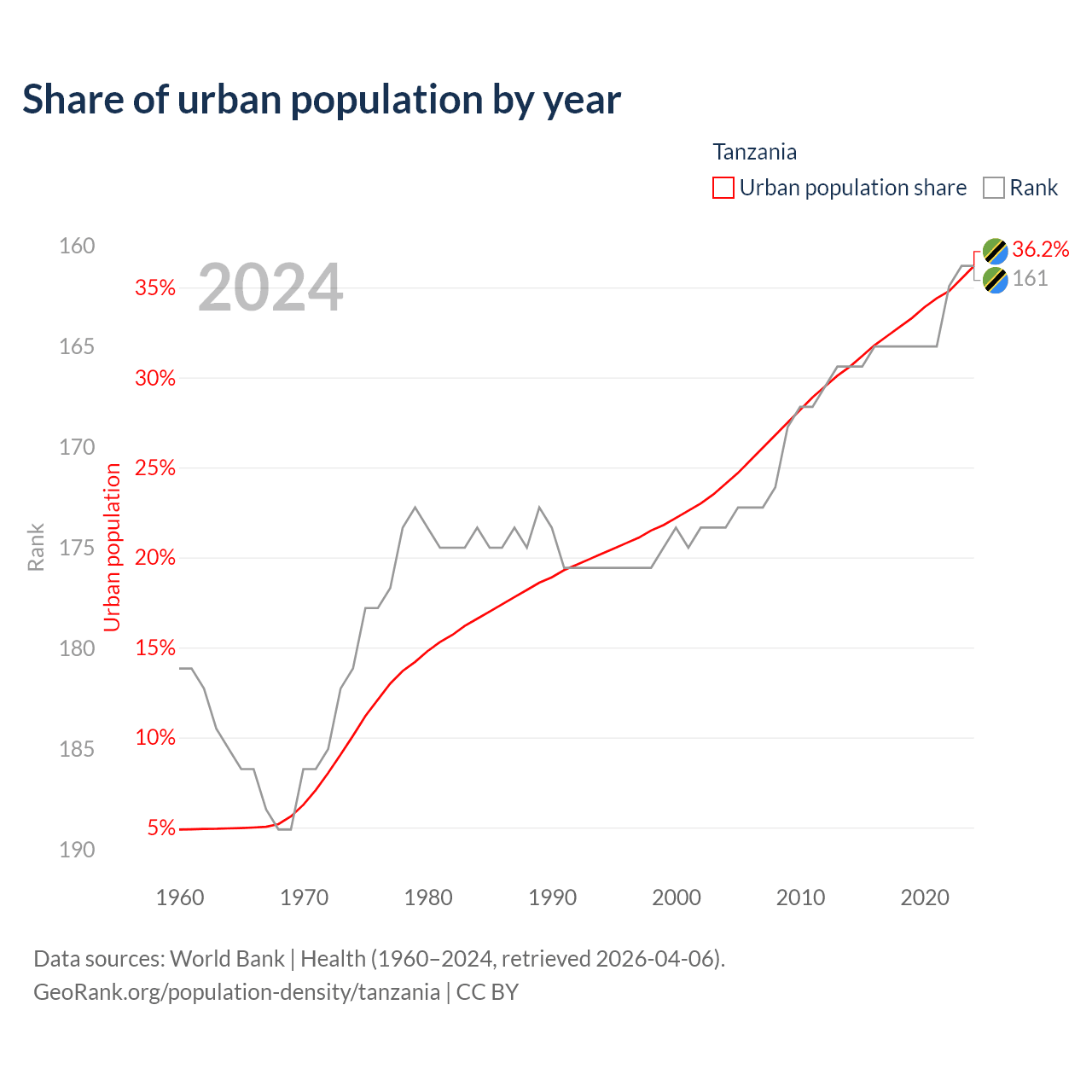 This chart shows the share of urban population in Tanzania from 1960 to 2024: 4.89% lived in urban areas in 1960, 22.2% in 2000, and 36.2% in 2024.
