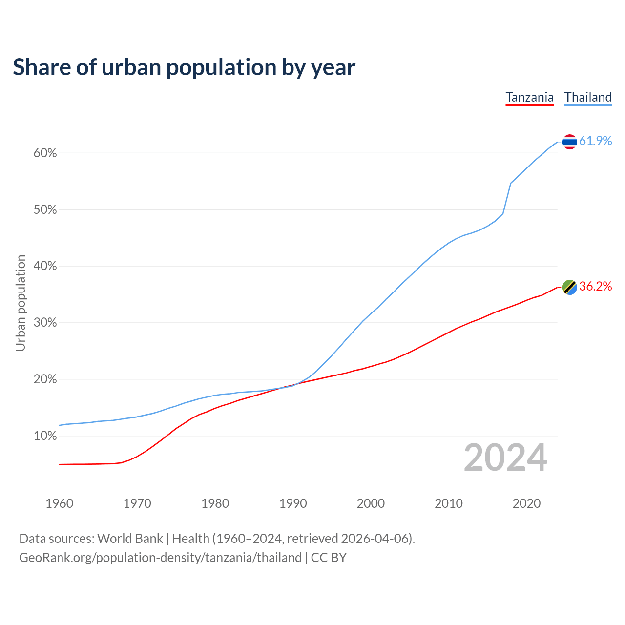 From 2004 to 2024, the share of urban population changed from 24.1% to 36.2% in Tanzania and from 36.8% to 61.9% in Thailand.