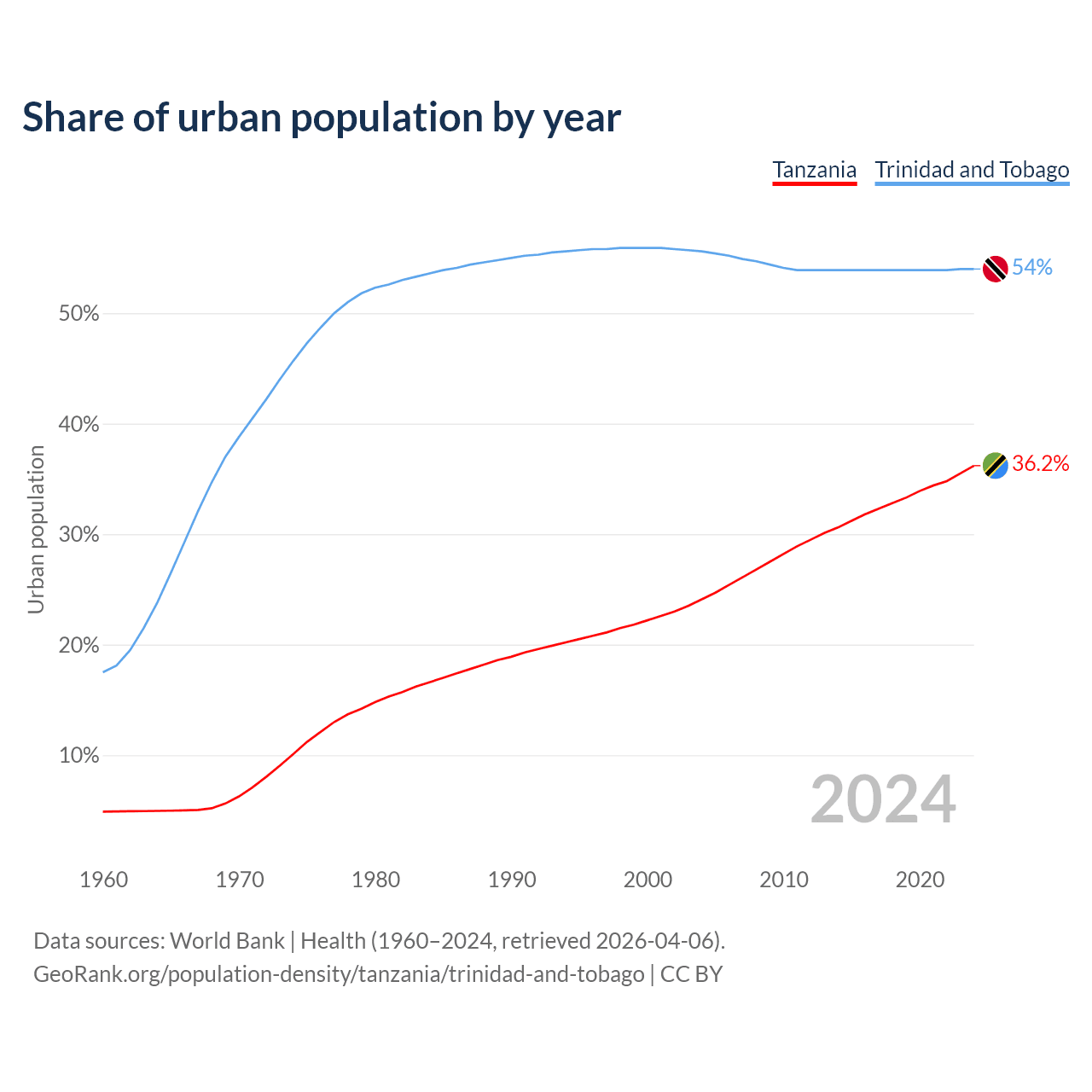 From 2004 to 2024, the share of urban population changed from 24.1% to 36.2% in Tanzania and from 55.6% to 54% in Trinidad and Tobago.