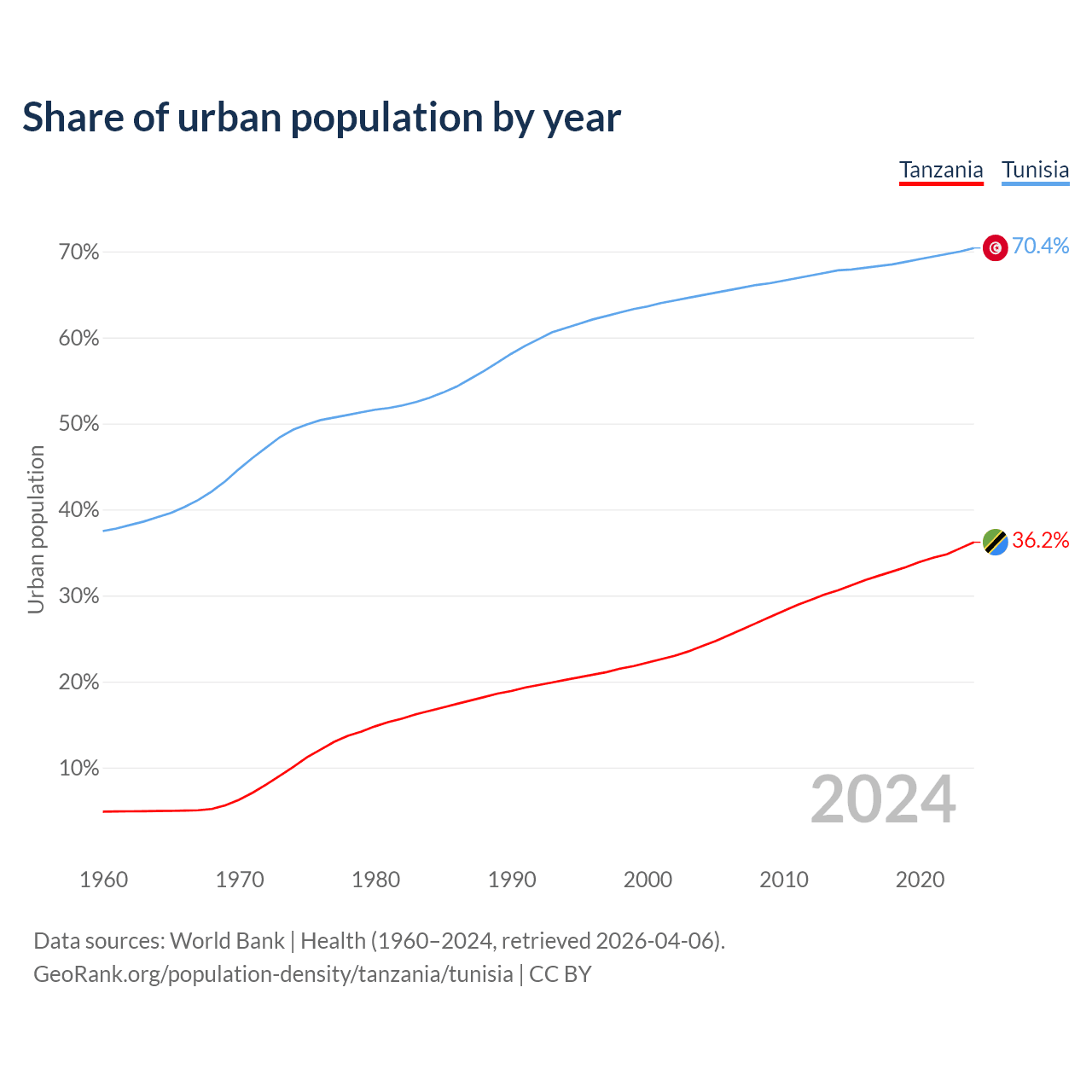 From 2004 to 2024, the share of urban population changed from 24.1% to 36.2% in Tanzania and from 64.9% to 70.4% in Tunisia.