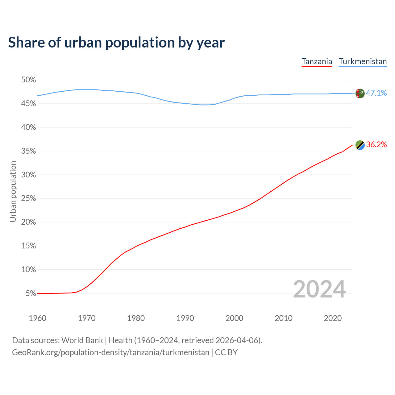 From 2004 to 2024, the share of urban population changed from 24.1% to 36.2% in Tanzania and from 46.7% to 47.1% in Turkmenistan.