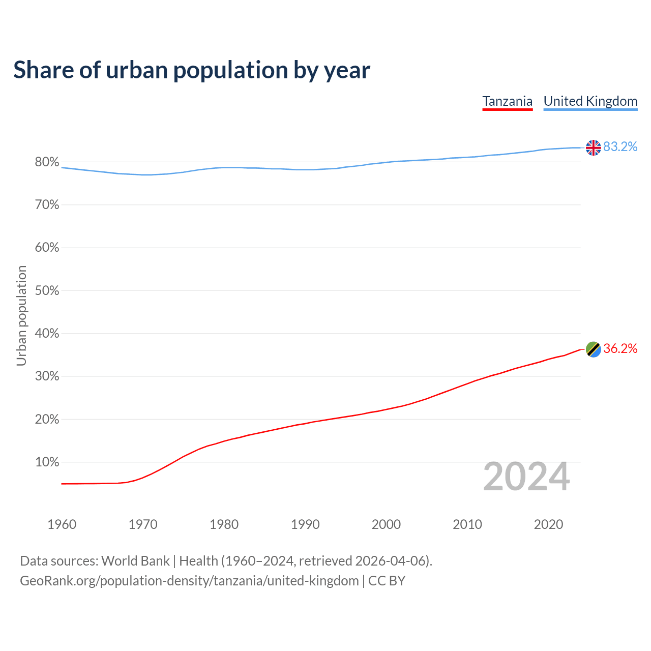 From 2004 to 2024, the share of urban population changed from 24.1% to 36.2% in Tanzania and from 80.3% to 83.2% in the United Kingdom.
