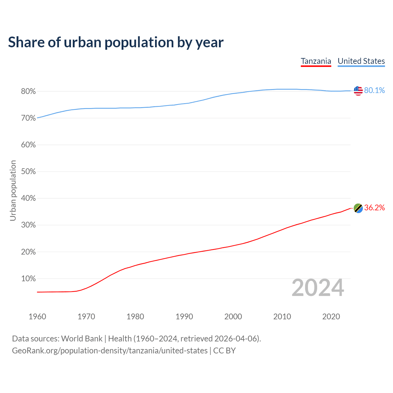From 2004 to 2024, the share of urban population changed from 24.1% to 36.2% in Tanzania and from 80% to 80.1% in the United States.
