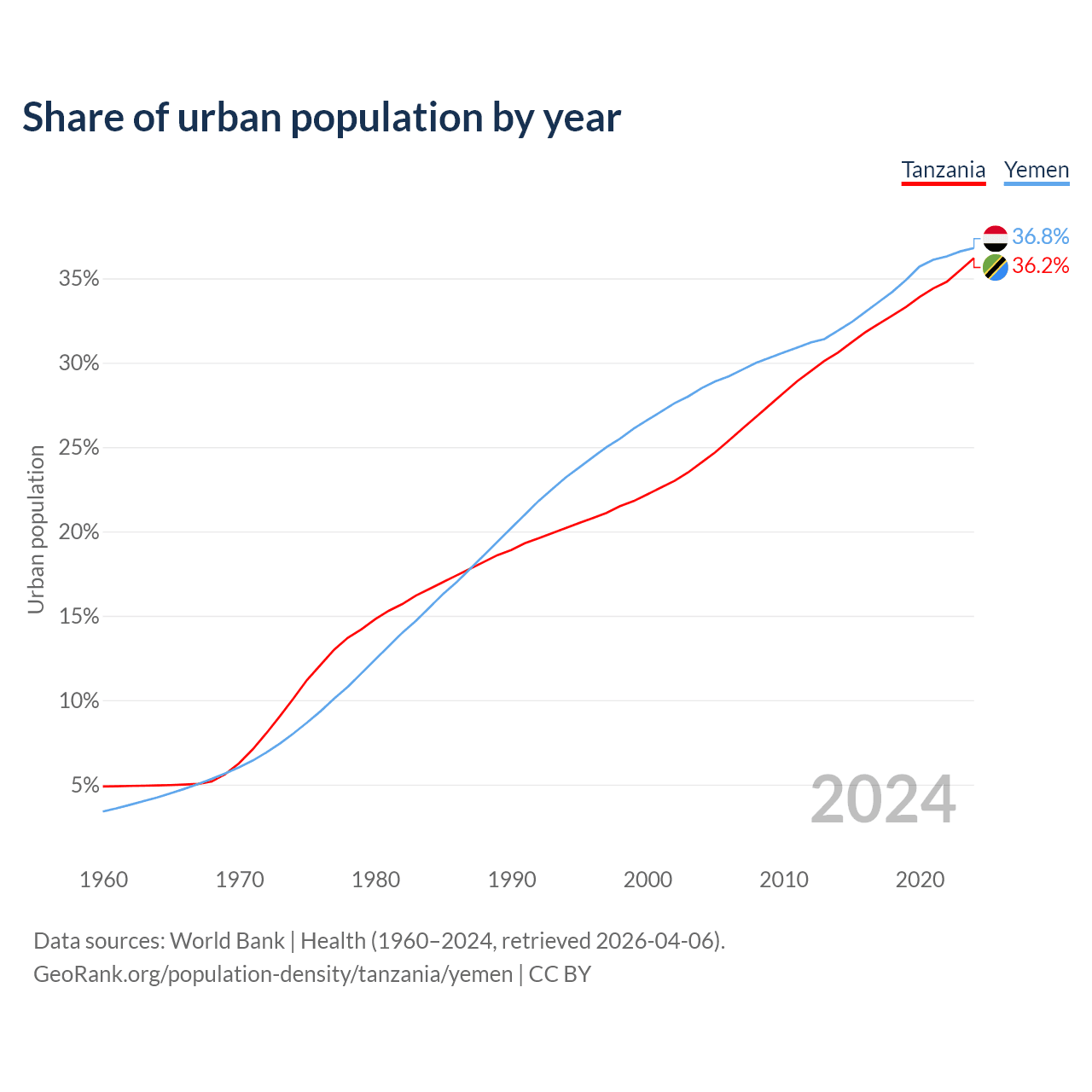 From 2006 to 2026, population density in Tanzania increased by 80.1%, compared to a 82.6% growth in Yemen.