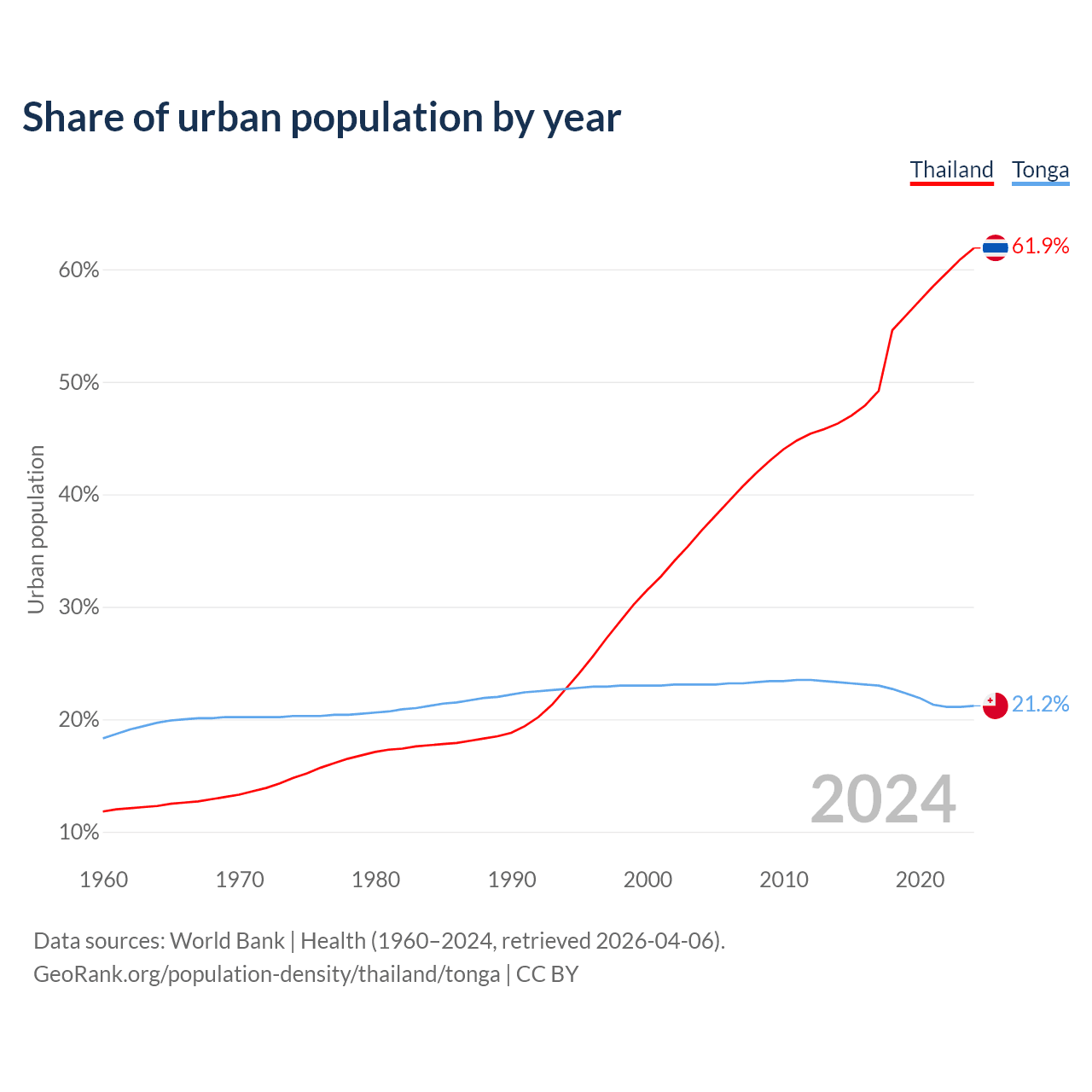 From 2006 to 2026, population density in Thailand increased by 7.52%, compared to a 2.77% decline in Tonga.
