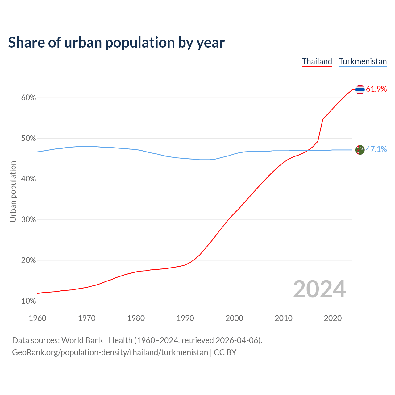 From 2004 to 2024, the share of urban population changed from 36.8% to 61.9% in Thailand and from 46.7% to 47.1% in Turkmenistan.