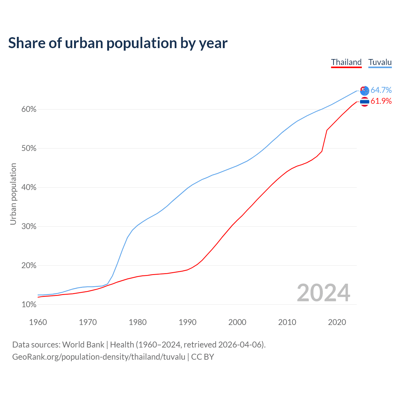 From 2004 to 2024, the share of urban population changed from 36.8% to 61.9% in Thailand and from 48.4% to 64.7% in Tuvalu.