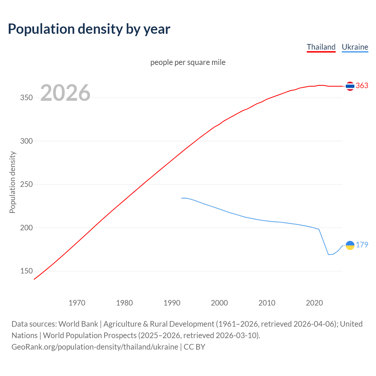 From 2006 to 2026, population density in Thailand increased by 7.52%, compared to a 15.1% decline in Ukraine.