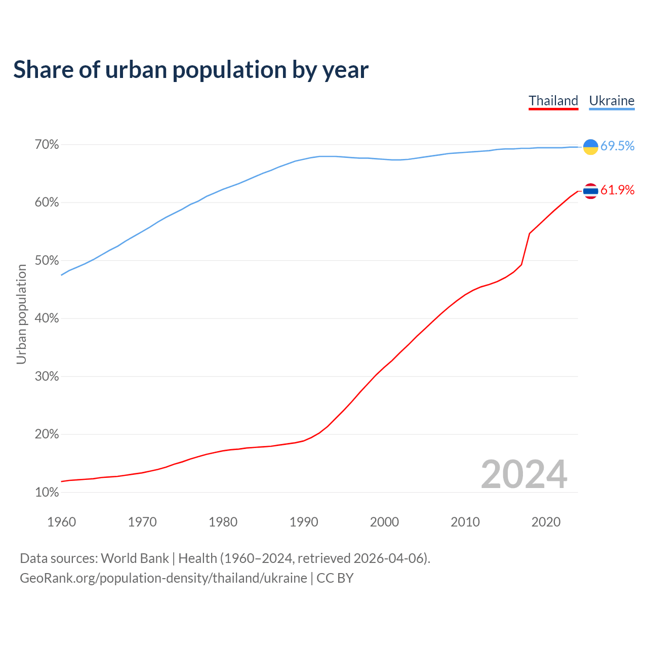 From 2004 to 2024, the share of urban population changed from 36.8% to 61.9% in Thailand and from 67.6% to 69.5% in Ukraine.