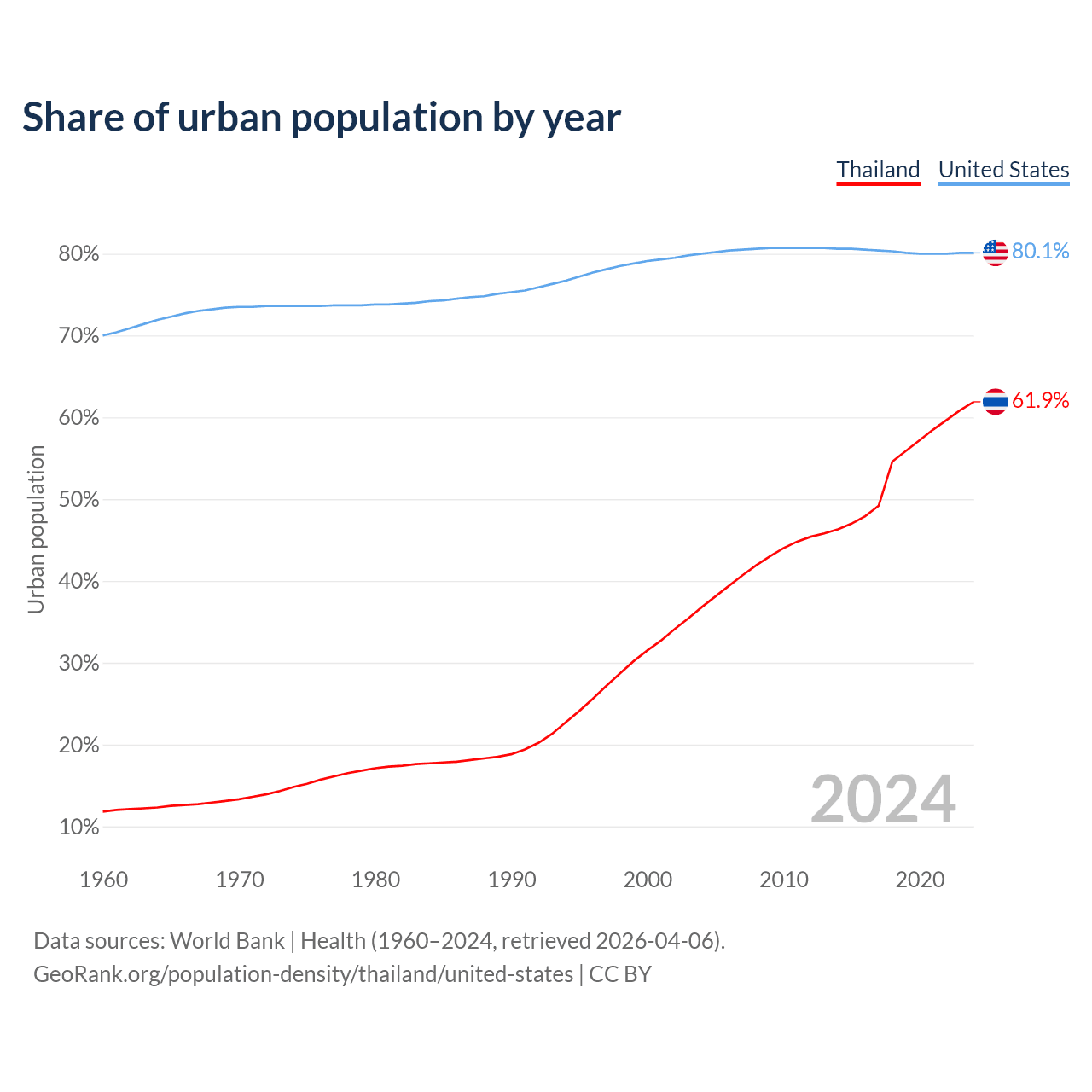 From 2004 to 2024, the share of urban population changed from 36.8% to 61.9% in Thailand and from 80% to 80.1% in the United States.