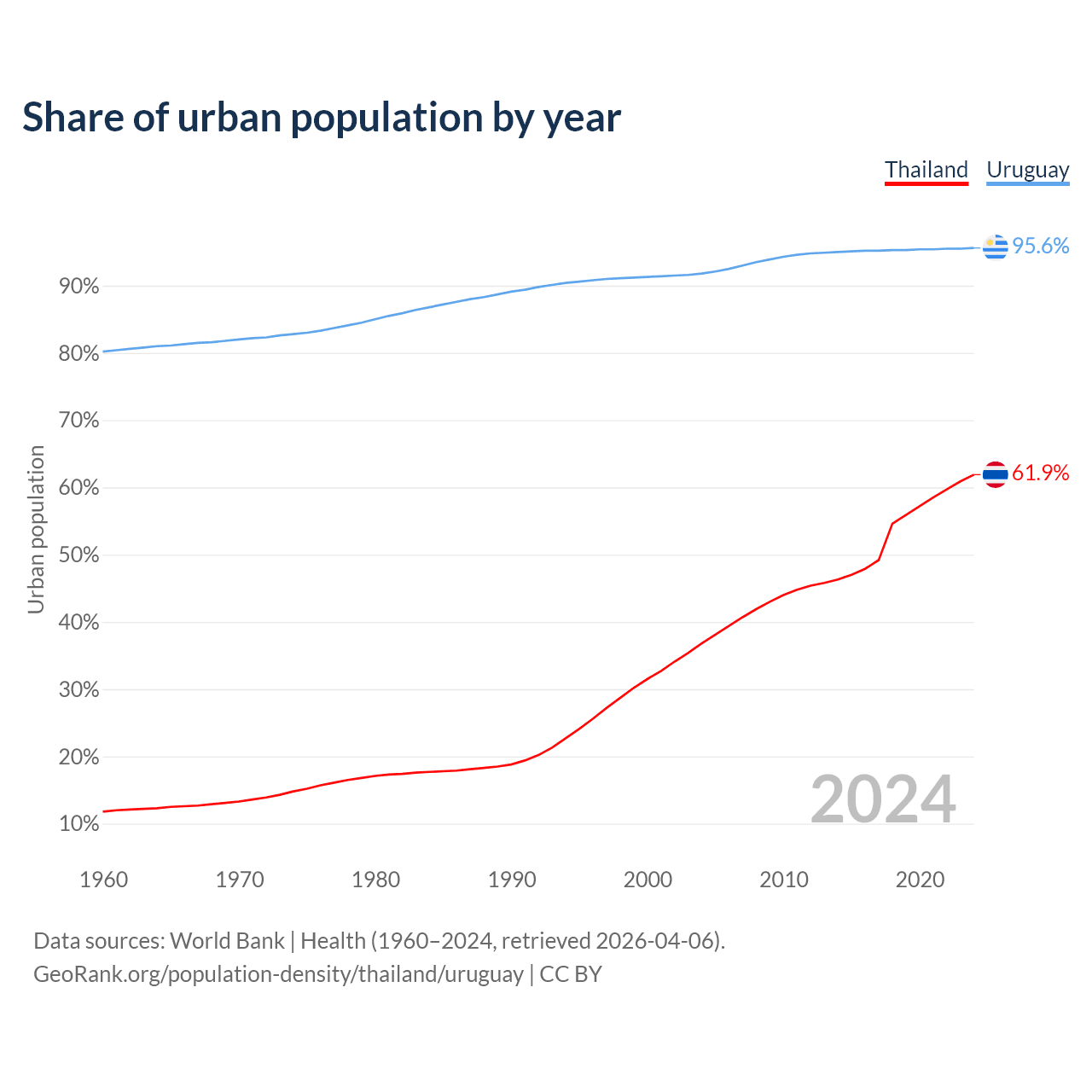 From 2004 to 2024, the share of urban population changed from 36.8% to 61.9% in Thailand and from 91.8% to 95.6% in Uruguay.