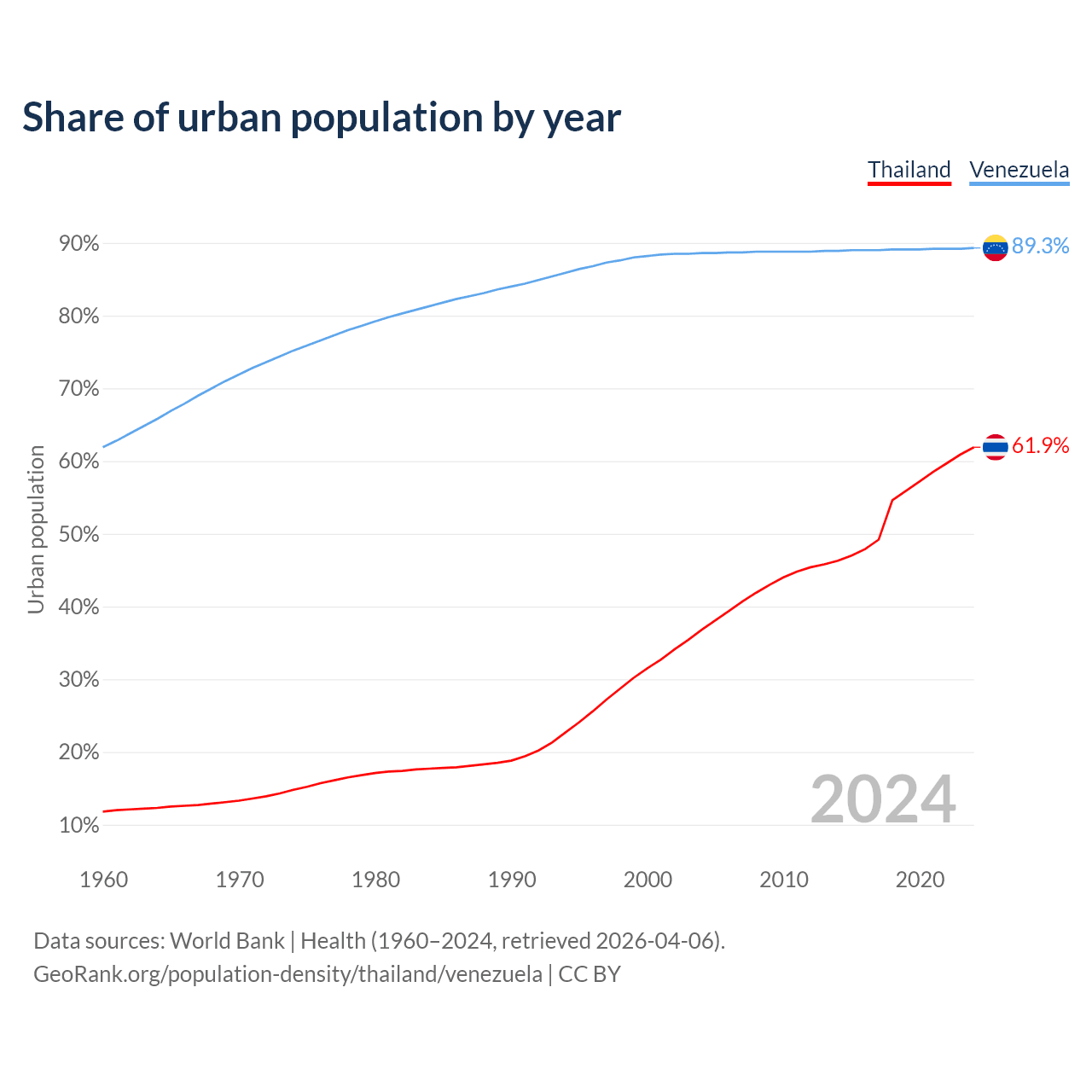 From 2004 to 2024, the share of urban population changed from 36.8% to 61.9% in Thailand and from 88.6% to 89.3% in Venezuela.