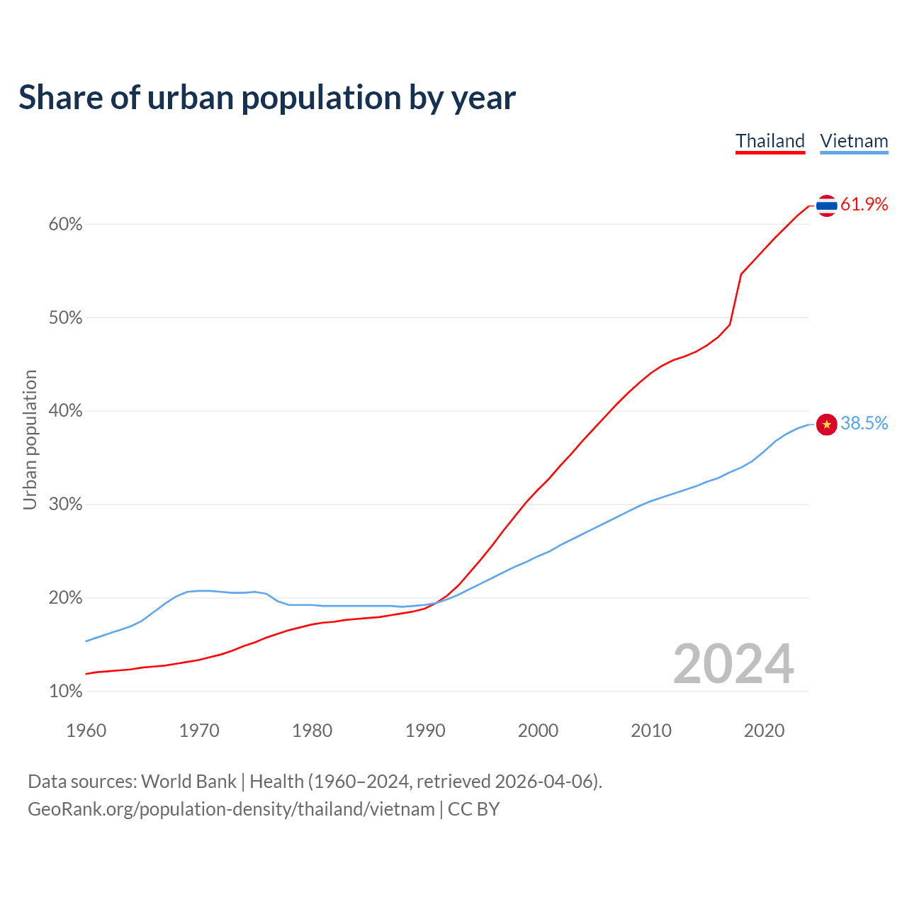 From 2004 to 2024, the share of urban population changed from 36.8% to 61.9% in Thailand and from 26.8% to 38.5% in Vietnam.